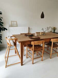 - Un plan de travail ou une table : Robuste et esthétique, le bois brut est parfait pour les cuisines qui mélangent praticité et charme rustique.