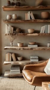 - Une étagère en bois brut : Pour exposer vos plus beaux ustensiles ou vos pots d’épices. Le bois brut se marie à merveille avec la céramique et les textiles naturels.