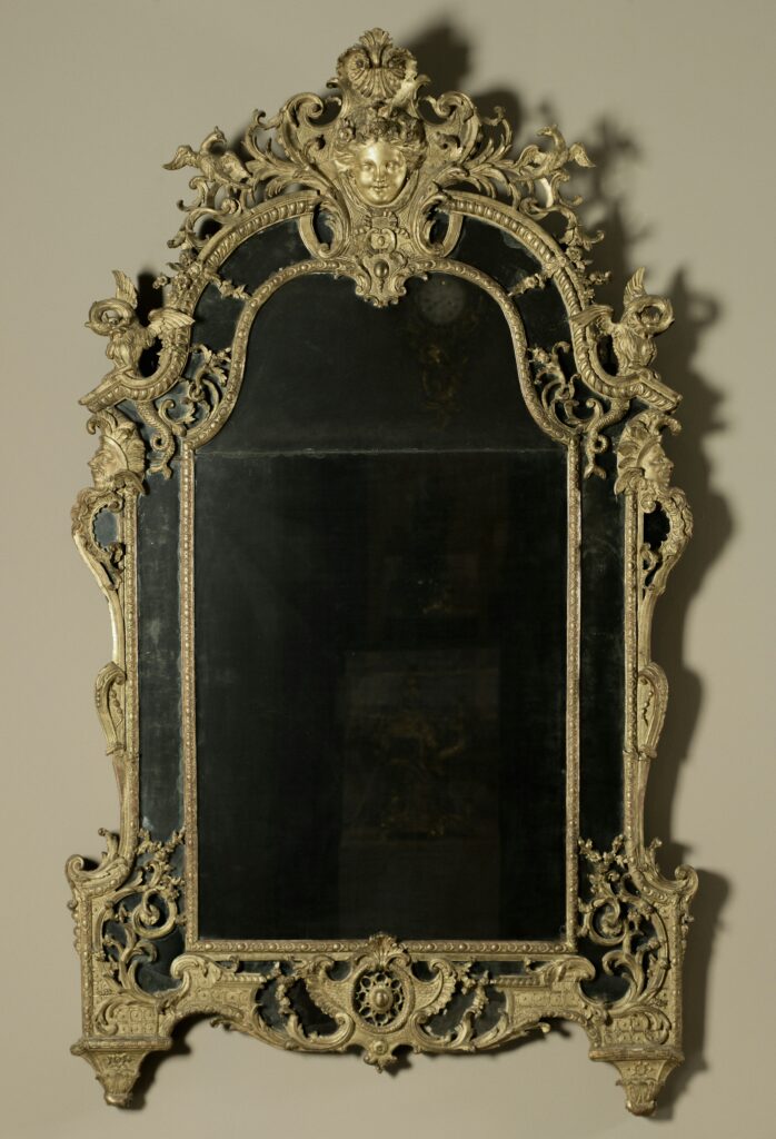 3. Le Miroir Trumeau : Placé à l’origine au dessus d’une cheminée, il s’agit d’un ensemble en bois sculpté comprenant une glace dans la partie basse et, souvent, une peinture ou un bas-relief dans la partie haute.