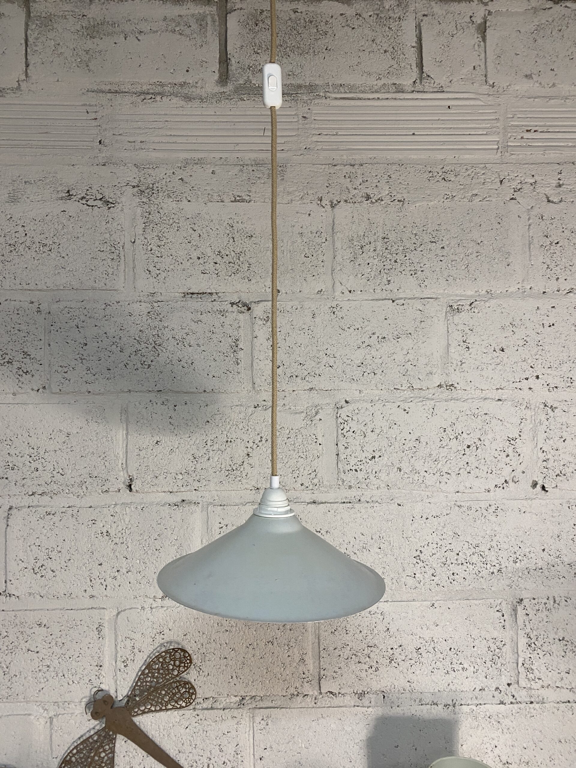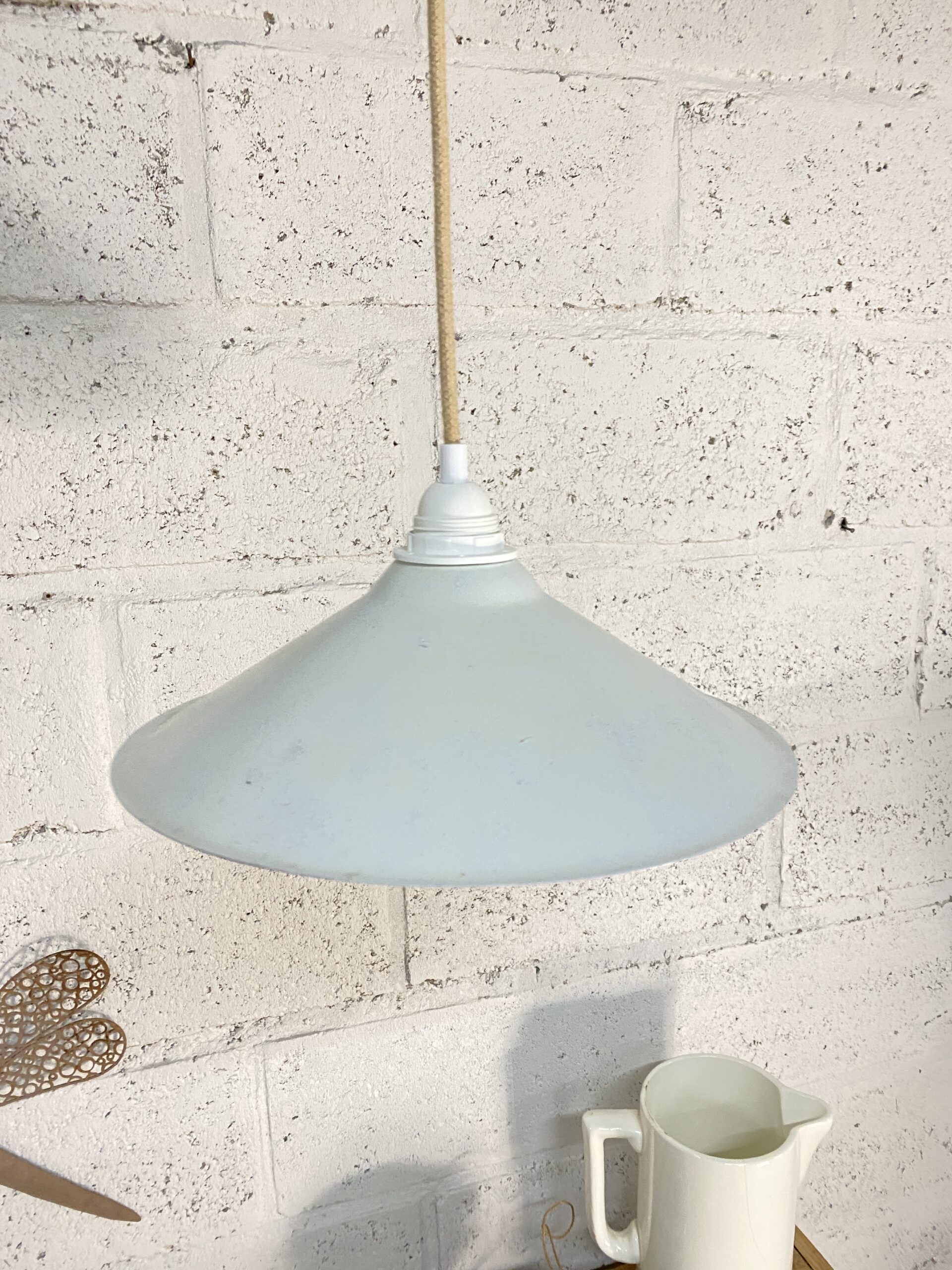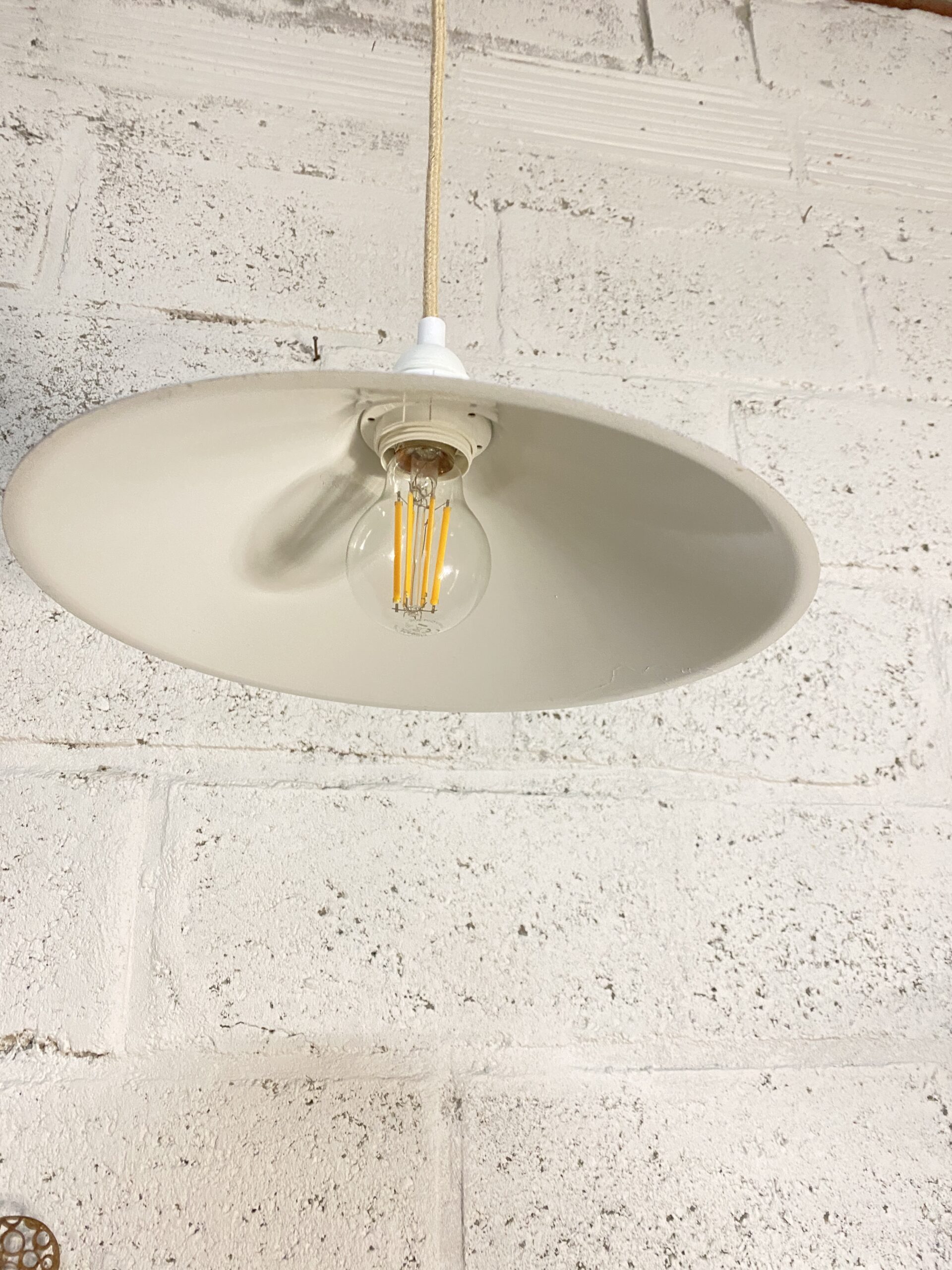 Baladeuse réalisée à partir d’un abat-jour en métal industriel. Il a été repeint en blanc. Il comporte des traces du temps et des imperfections qui lui donnent tout son caractère. Le fil est en tissu beige, la douille, l’interrupteur et la prise sont blancs.(Vendue sans ampoule).