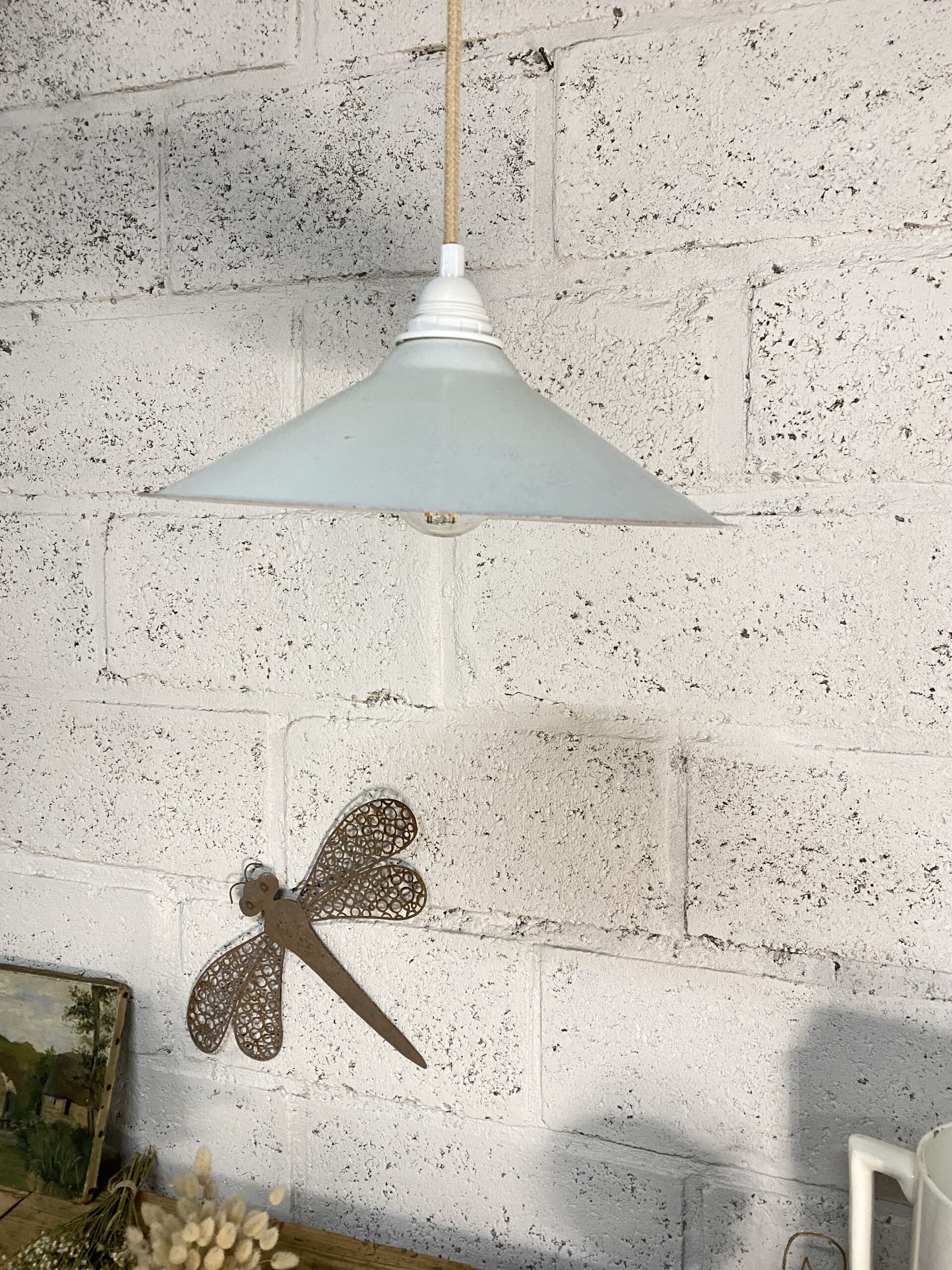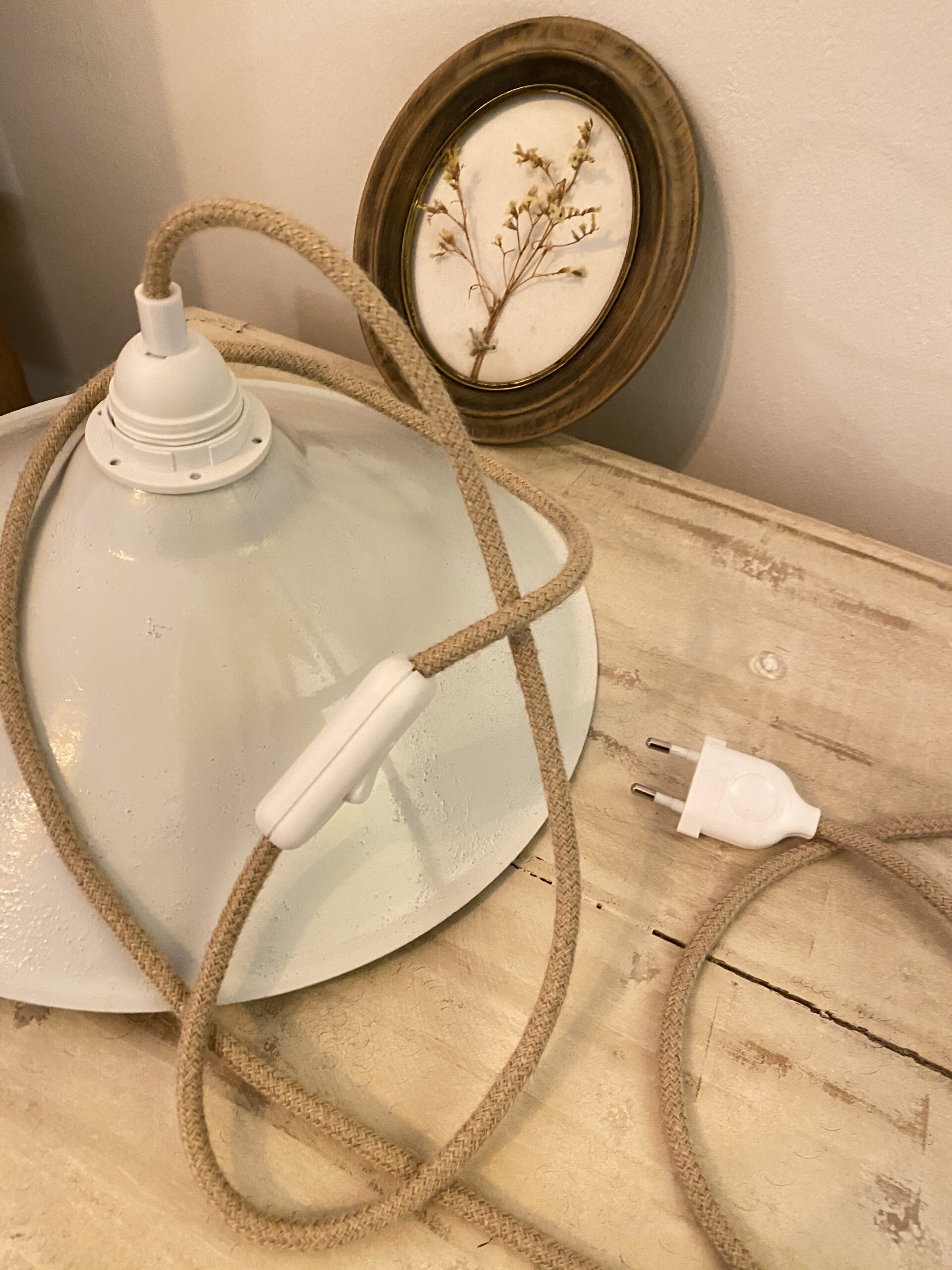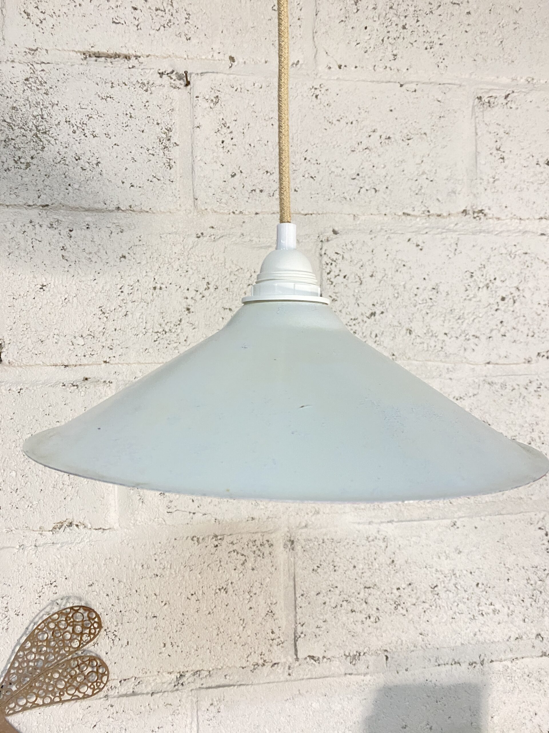 Baladeuse réalisée à partir d’un abat-jour en métal industriel. Il a été repeint en blanc. Il comporte des traces du temps et des imperfections qui lui donnent tout son caractère. Le fil est en tissu beige, la douille, l’interrupteur et la prise sont blancs.(Vendue sans ampoule).