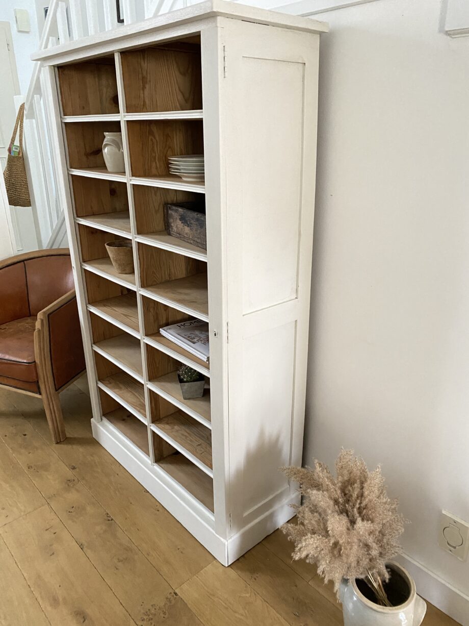 Magnifique meuble cartonnier ancien qui a été repeint pour lui redonner du pep’s ! Comme il y avait encore les anciens cartons d’origine quand je l’ai récupéré, les cases sont en parfait état. Il d’abord a été poncé, nettoyé, traité et repeint, puis ciré pour créer une patine mat et « salie » par endroits. La serrure des barres latérales de maintien des cartons fonctionne. Il trouvera facilement sa place comme vaisselier ou autre meuble de rangement.