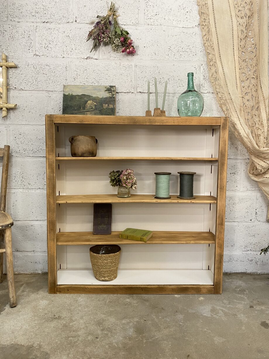 Petite bibliothèque toute mignonne avec ses coins arrondis et ses 3 étagères amovibles. Elle a été poncée, traitée et l’intérieur repeint. Le bois est ciré et les étagères passées au saturateur. Facile à placer avec sa petite taille, elle ira aussi bien dans une chambre d’enfant que dans un salon.