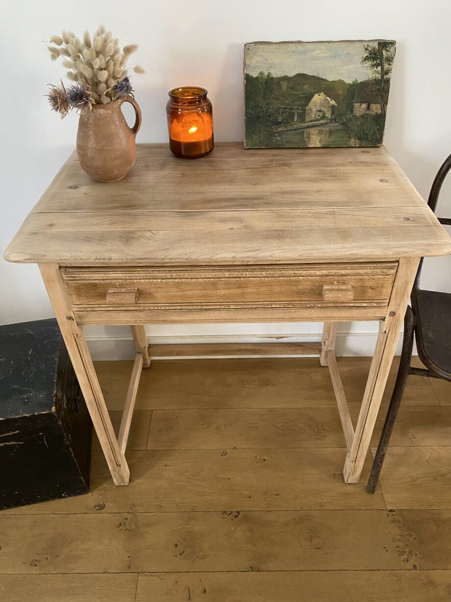 Petit bureau en bois massif. Entièrement poncé, traité et ciré sauf le plateau qui est verni. Il possède un grand tiroir qui a été repeint en noir. A placer dans une chambre ou dans votre salon, comme vous préférez.