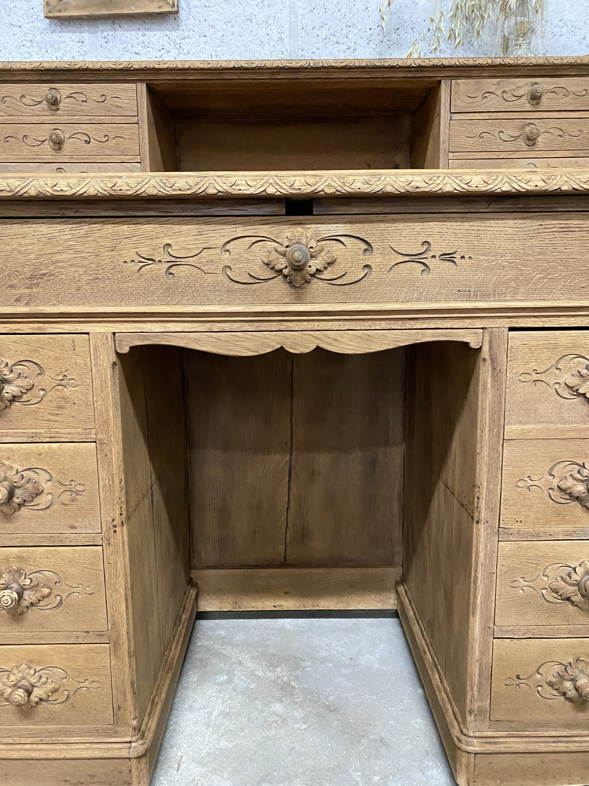 Magnifique bureau en chêne massif ancien (probablement 19eme) avec de multiples tiroirs et une case de rangement. Il a été entièrement poncé, traité et ciré. Il comportait des serrures sans clés à certains des tiroirs, elles ont été retirées et remplacées des boutons en bois. La tablette avec porte-plume a été réparée et peinte en vert. L’un des tiroirs de droite est double, avec une tablette amovible et un « faux fond » pour pouvoir cacher ses secrets. Son dos est aussi magnifique, il peut être utilisé pour séparer une pièce par exemple. À noter quelques petites tâches persistantes au niveau de la case. C’est un meuble remarquable qui sera du bel effet dans votre décoration.