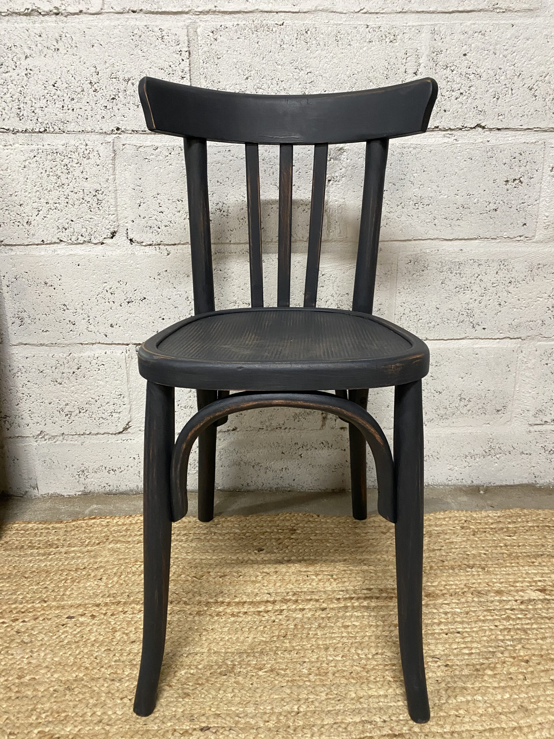 Chaise bistrot avec des rainures sur l’assise qui permettent de lui donner une jolie patine. Elle a été poncée et repeinte en noir. Son dossier arrondi est très confortable et ses pieds courbés lui donnent une jolie ligne.