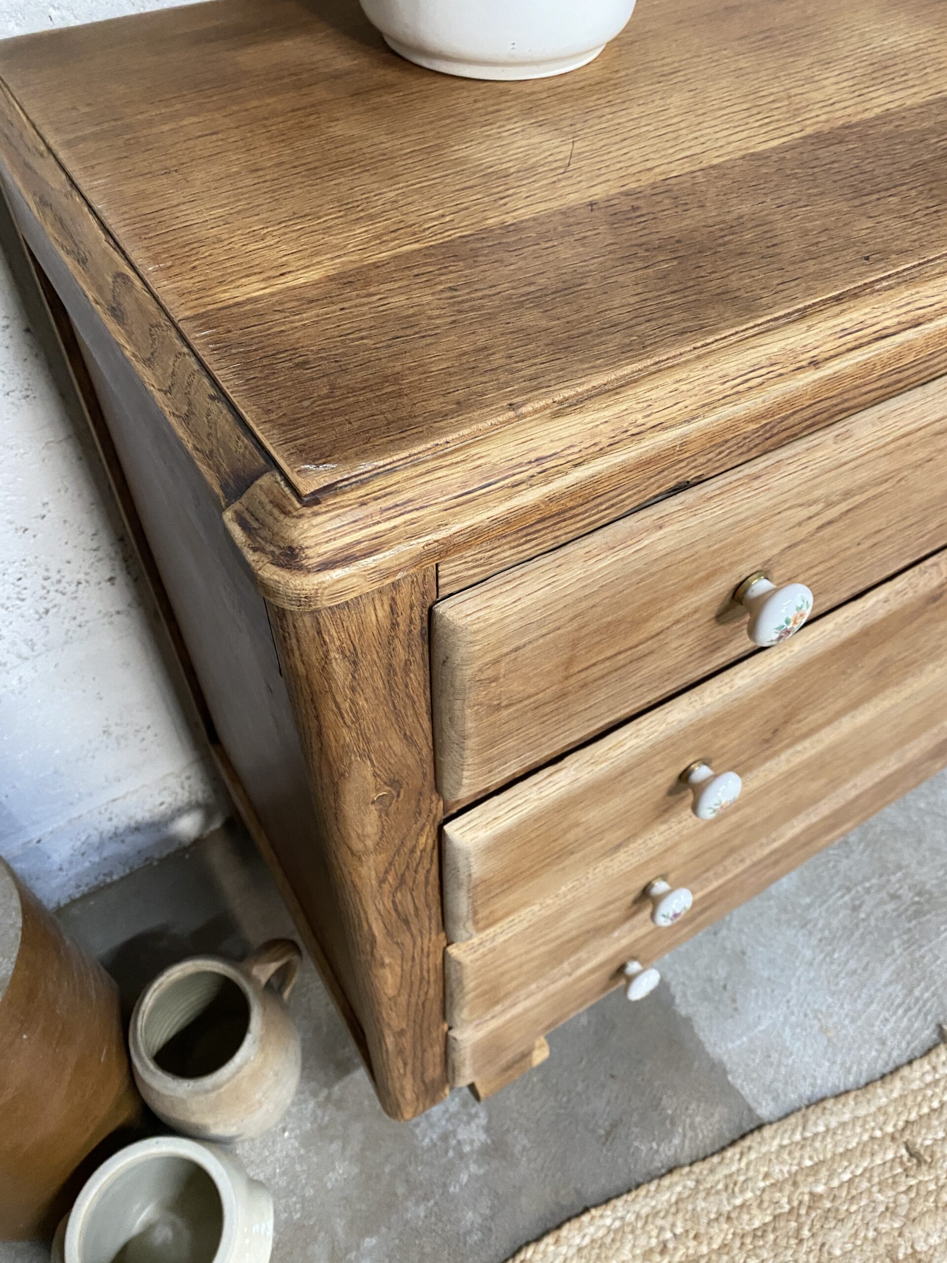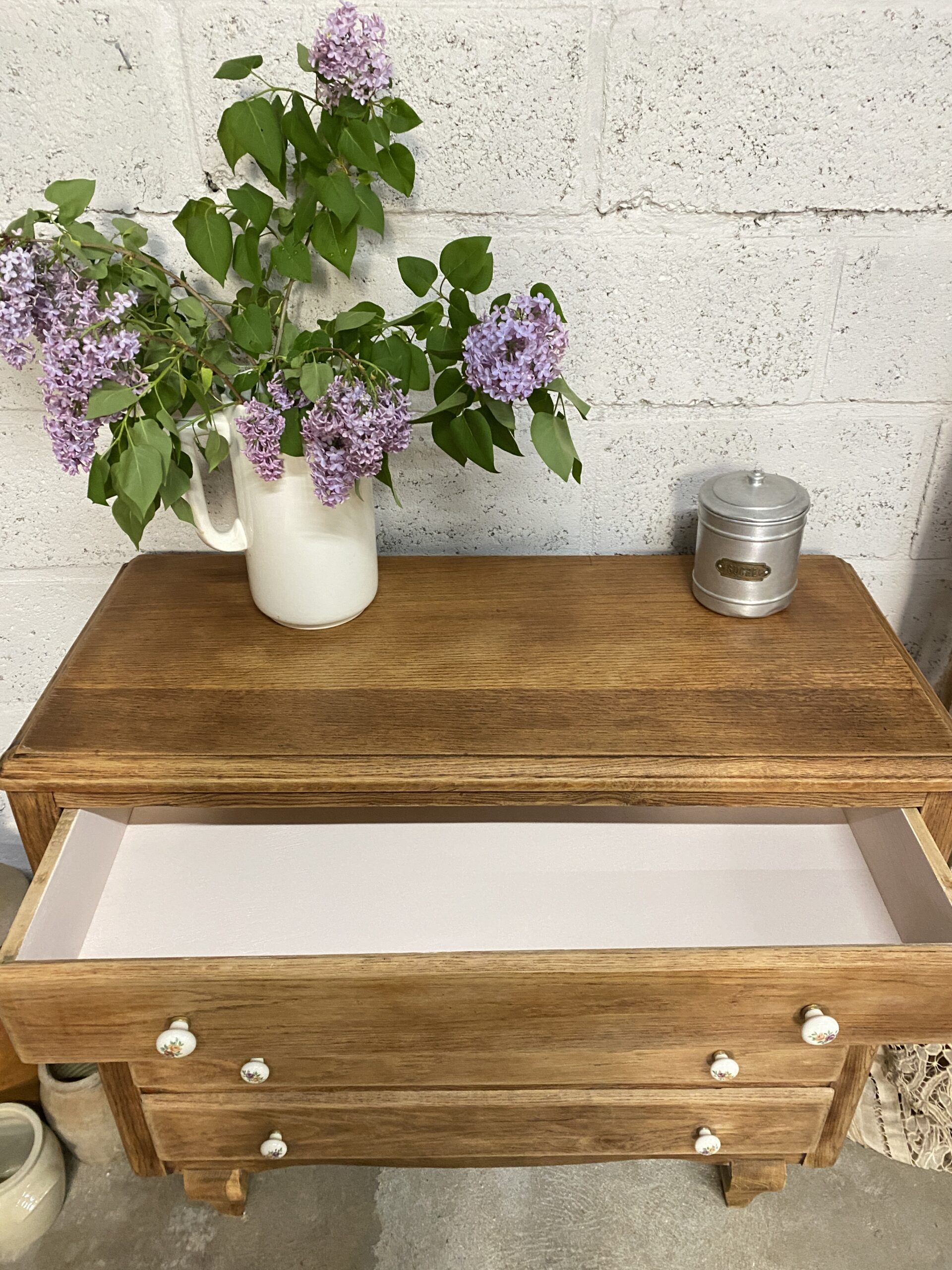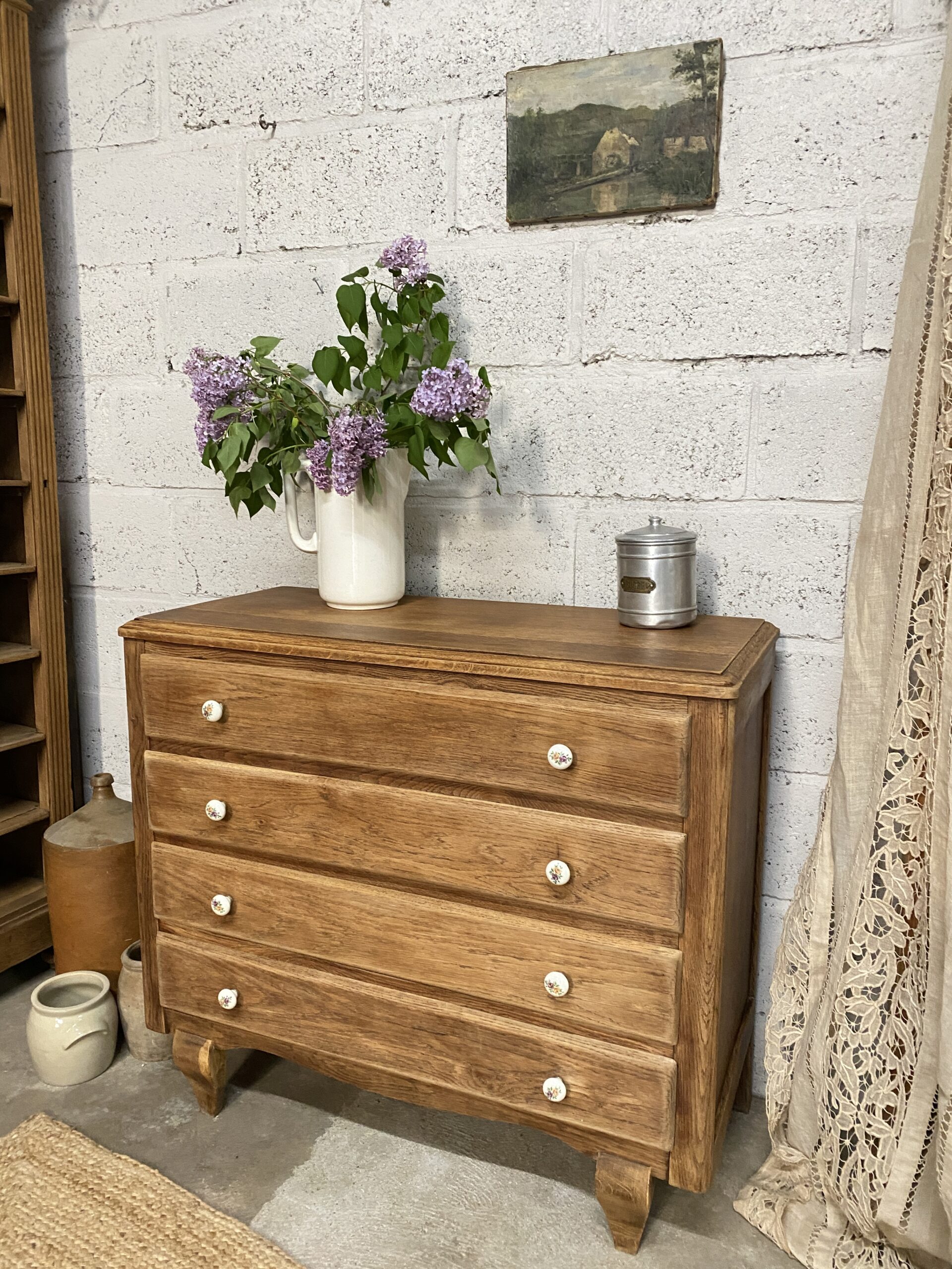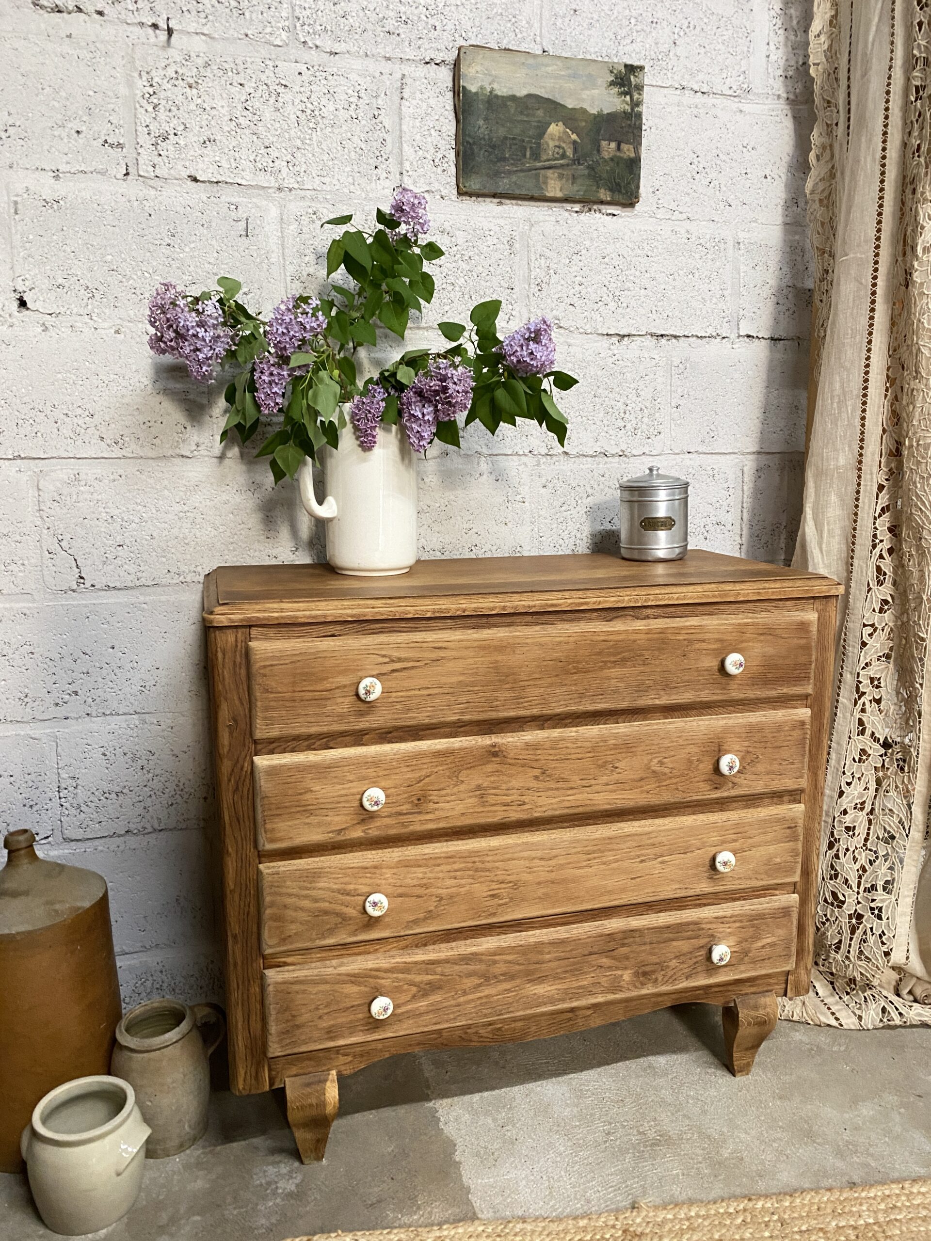 Commode ancienne qui possède 4 tiroirs avec des poignées en porcelaine fleuries d’origine. Elle a été poncée et traitée (le bas intérieur  avait pas mal attaqué par des vrillettes) puis cirée entièrement. L’intérieur des tiroirs a été repeint en rose pâle pour créer un rappel avec les petites fleurs des poignées. Je trouve qu’elle a un petit look British qui apportera un style cottage à votre intérieur.