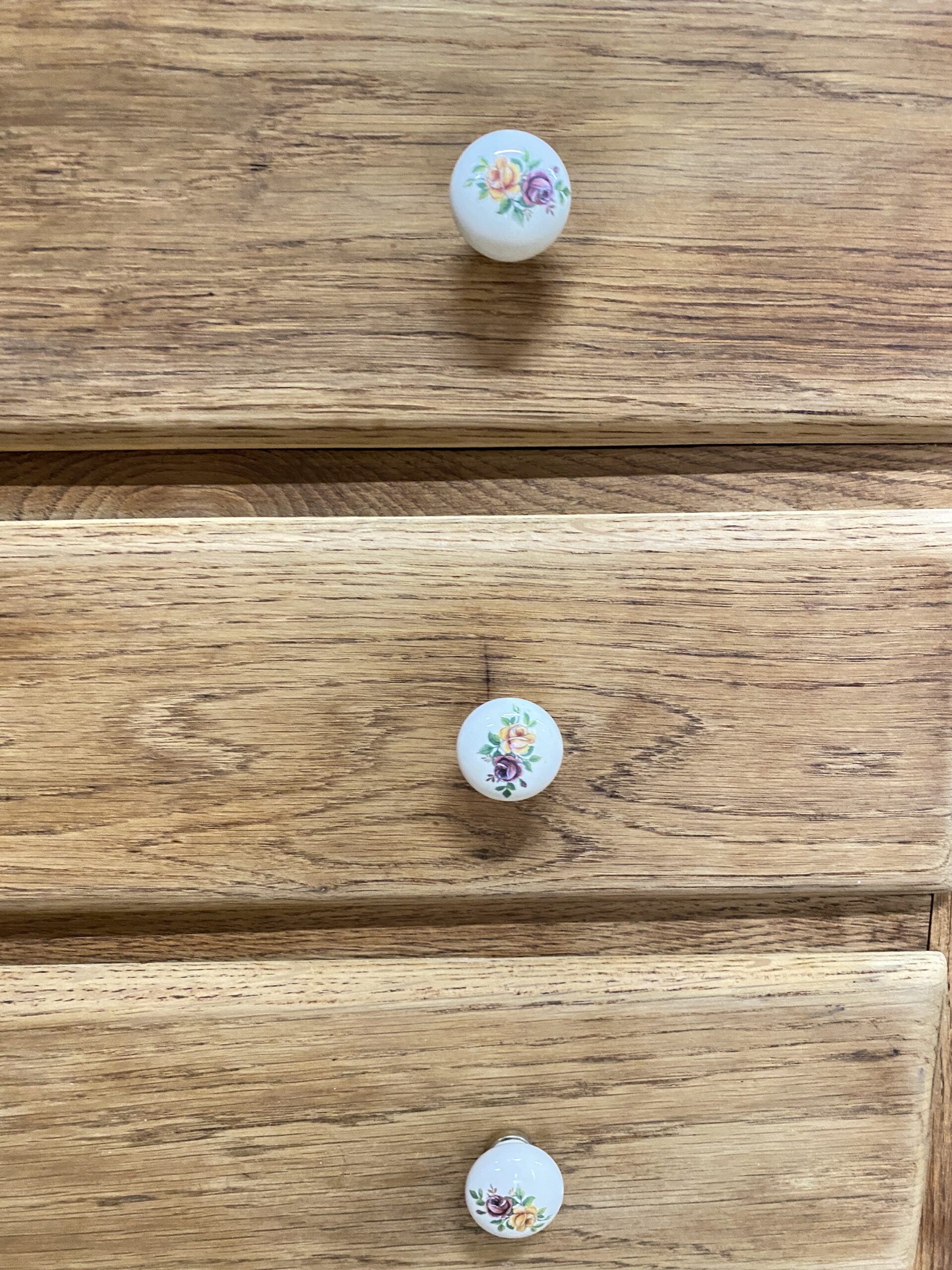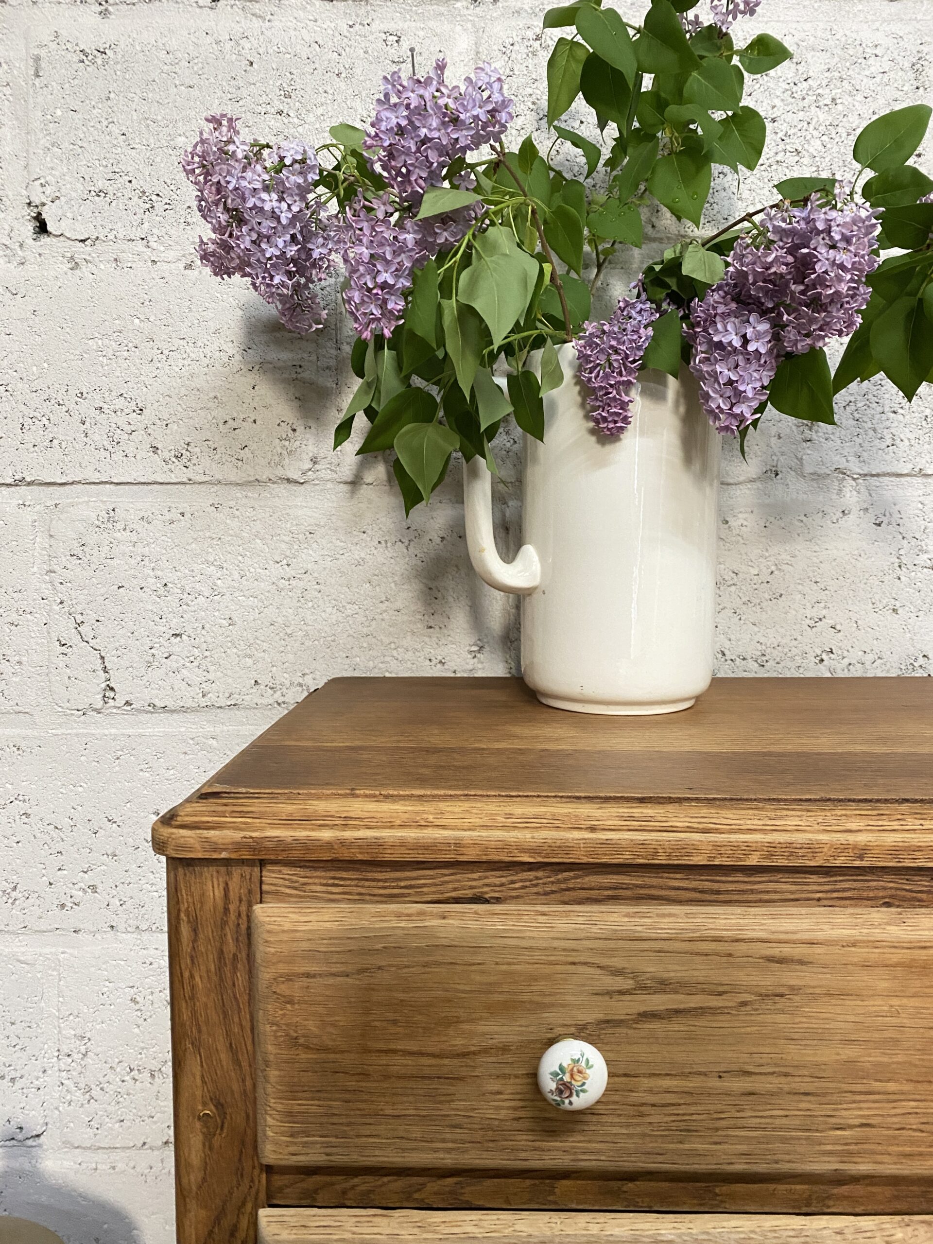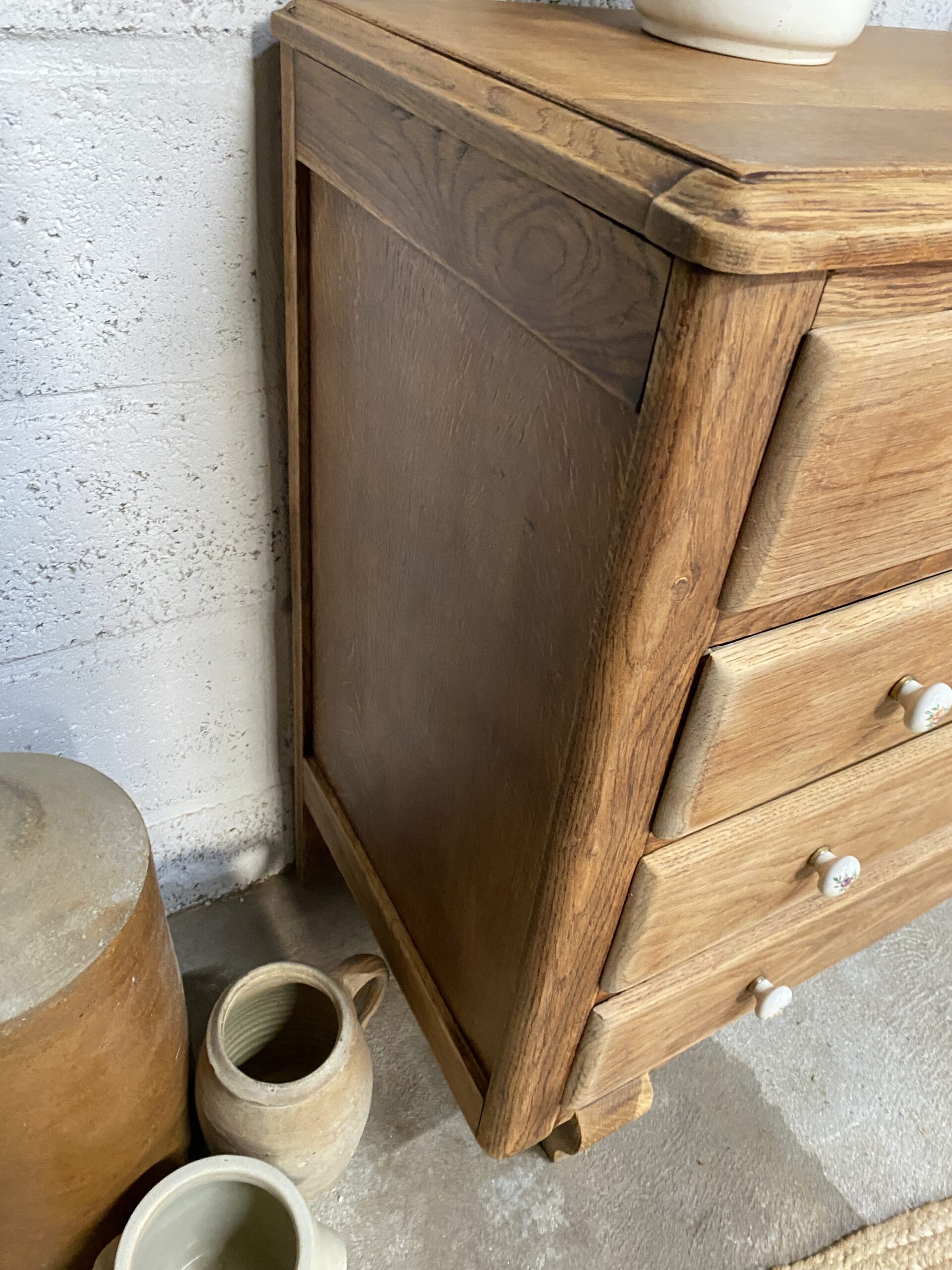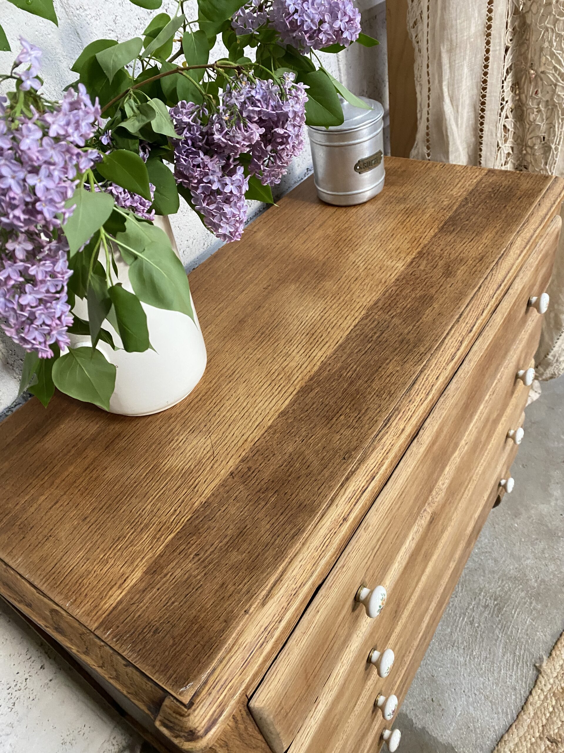 Commode ancienne qui possède 4 tiroirs avec des poignées en porcelaine fleuries d’origine. Elle a été poncée et traitée (le bas intérieur  avait pas mal attaqué par des vrillettes) puis cirée entièrement. L’intérieur des tiroirs a été repeint en rose pâle pour créer un rappel avec les petites fleurs des poignées. Je trouve qu’elle a un petit look British qui apportera un style cottage à votre intérieur.
