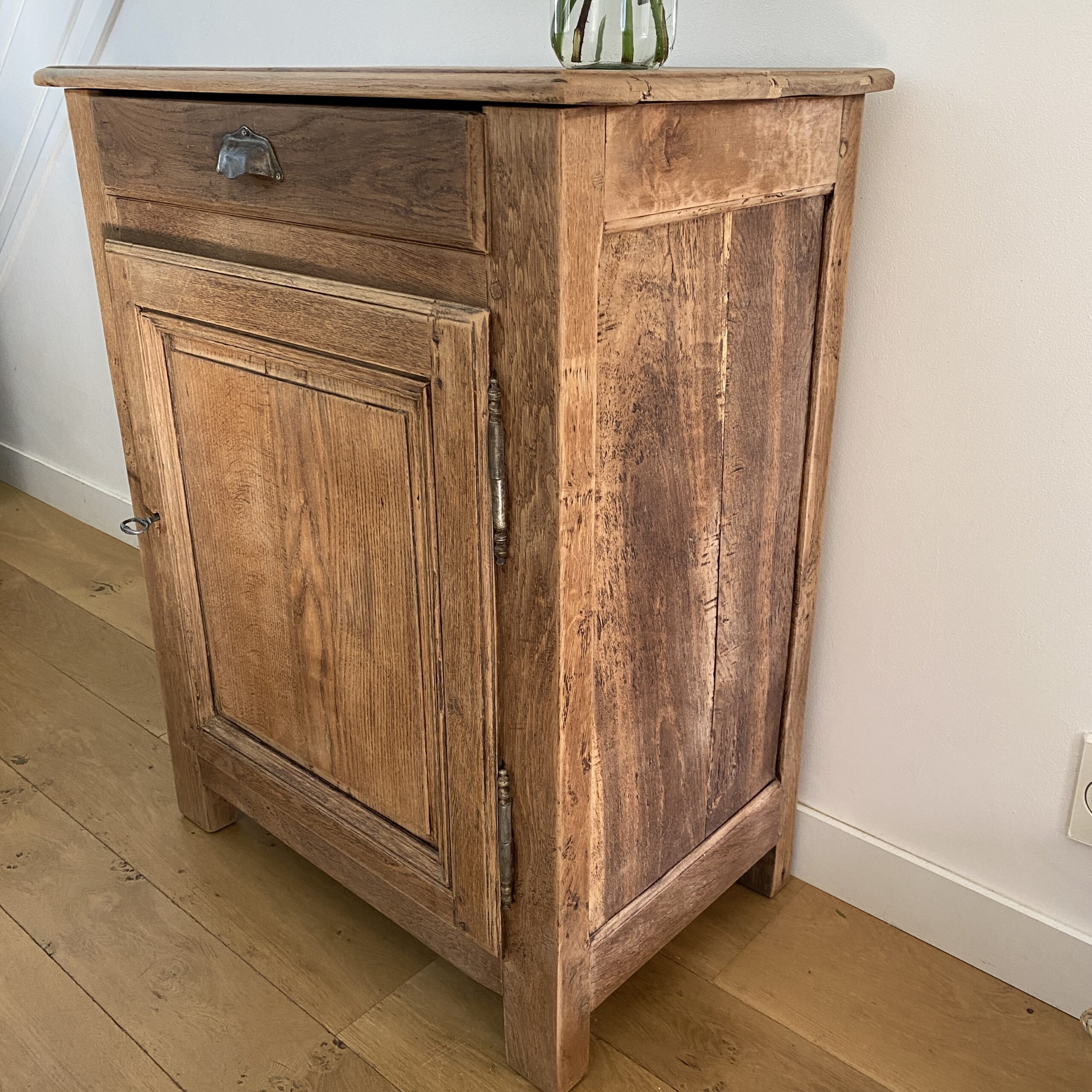 Confiturier ancien en bois massif. Il a été déciré, poncé puis le plateau verni (incolore effet ciré). Le reste du meuble est ciré. L’intérieur du tiroir et l’étagère ont été recouvert d’un papier joli peint printanier. La serrure d’origine fonctionne parfaitement et la poignée a été remplacée par une poignée coquille ancienne chinée. À noter : un trou avait précédemment été découpé dans le fond (voir photo) surement pour faire passer des câbles. Ce très beau confiturier pourra être placé dans une entrée, un salon ou même une chambre.