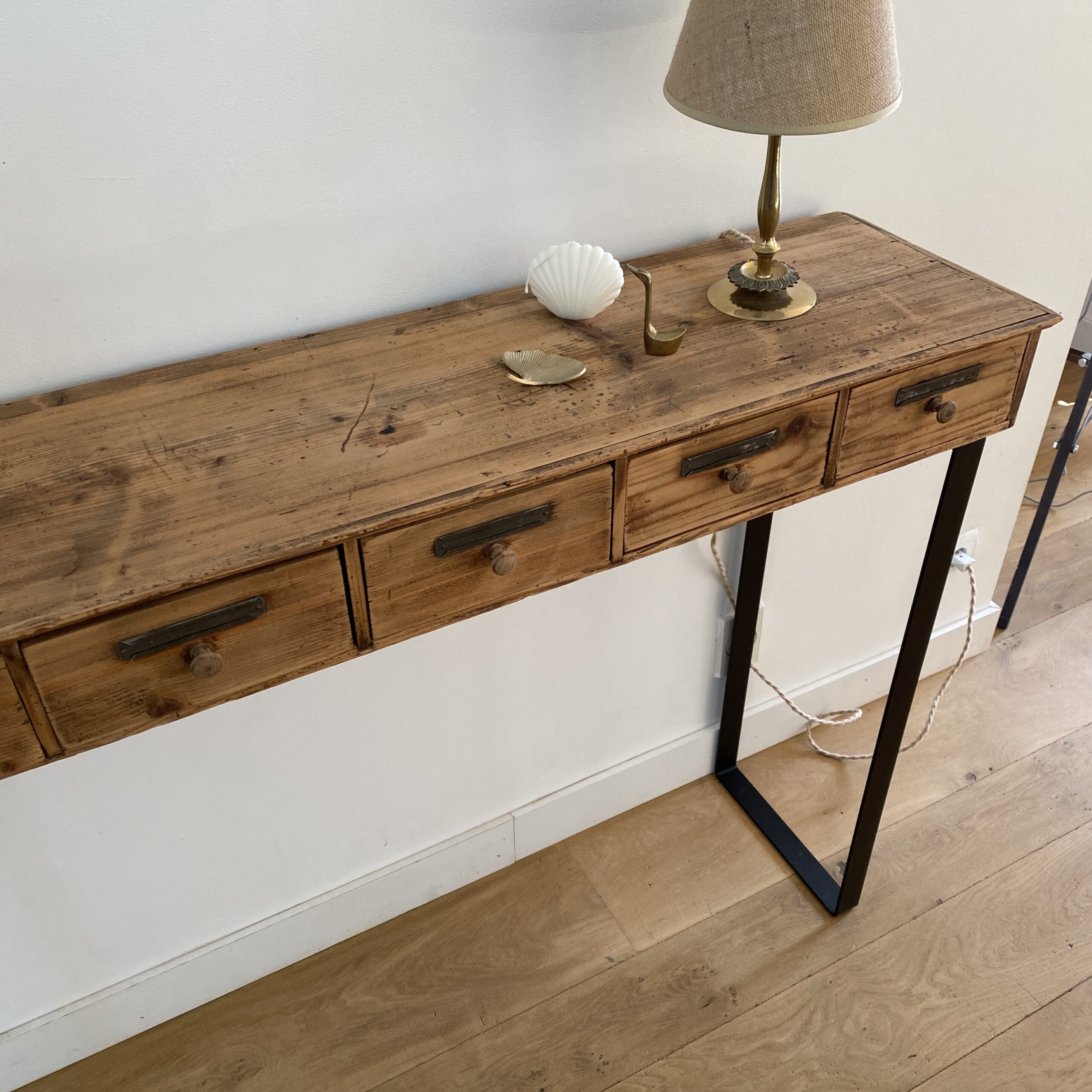 Console en bois brut à tiroirs. Elle a été réalisée à partir du haut d’un vieux meuble comportant 6 tiroirs. Les porte-étiquettes et les boutons sont d’origine.  Les pieds sont sobres, en métal noir. À noter : L’un des tiroirs a une tâche qui ne part pas et l’un des boutons est cassé (voir photos).  À  placer dans une entrée par exemple (à chacun son bazar !).
