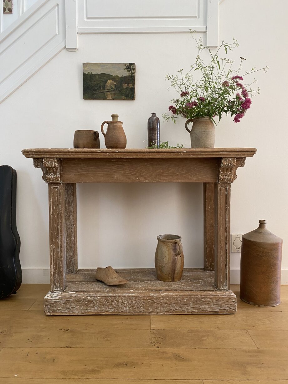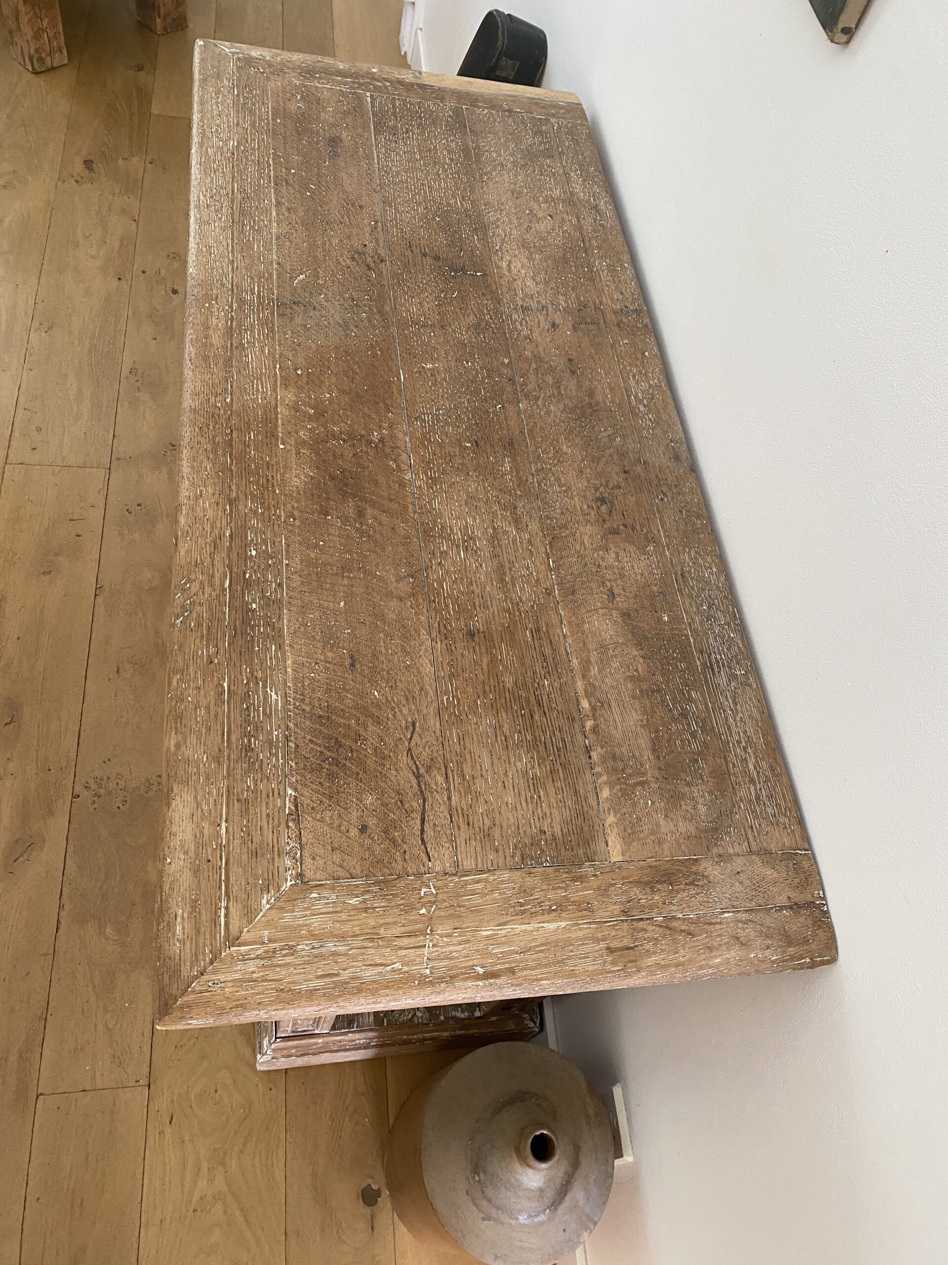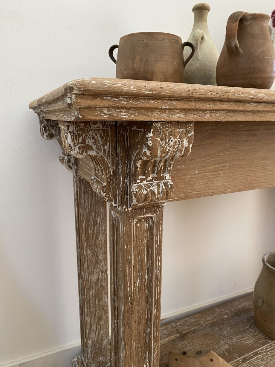 Très jolie console en chêne massif. Elle a été décapée, poncée, traitée et le plateau du haut verni (incolore). Il reste quelques petites tâches sur le plateau. Elle possède des ornements et les pieds sont légèrement travaillés eux-aussi. Une partie de la patine grise d’origine a été laissée pour marquer le veinage et lui donner plus de caractère. Elle sera parfaite dans une entrée, ou pourquoi pas en meuble télé.