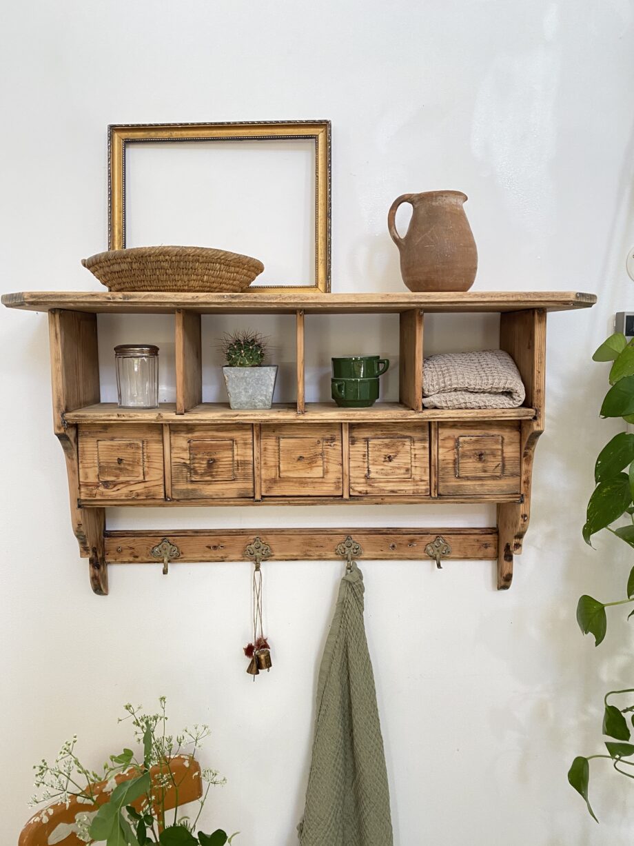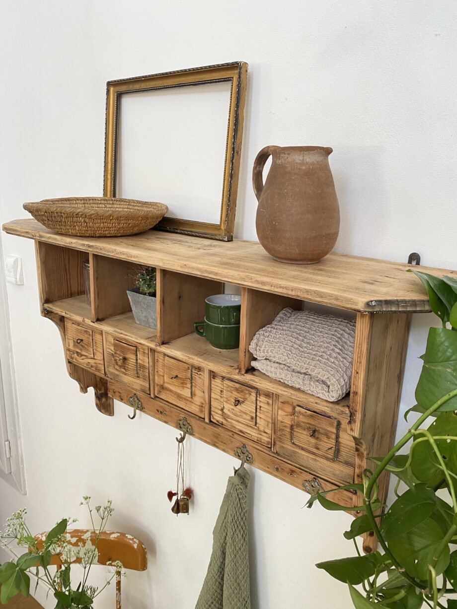 Très jolie étagère murale en sapin avec casiers et tiroirs. Elle a été décapée, poncée, traitée et cirée. Il reste quelques traces de son ancienne patine. L’intérieur des tiroirs a été peint dans un très joli vert bronze. Elle possède aussi de très jolis crochets  (dont l’un a été cassé et est donc plus court ; cf. photos) ce qui en fera un élément de déco et pratique dans une cuisine ou une entrée.