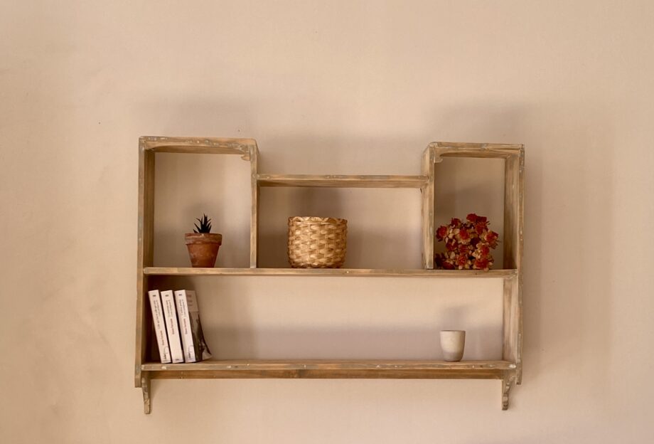 Étagère murale patinée à casiers. Hyper pratique pour mettre en valeur vos plantes vertes en accumulation ou vos parfums dans une salle bain. Elle possède de jolis détails d’ornement et quelques imperfections dues à son âge. Poncée, nettoyée traitée (en prévention), elle est prête à être adoptée.