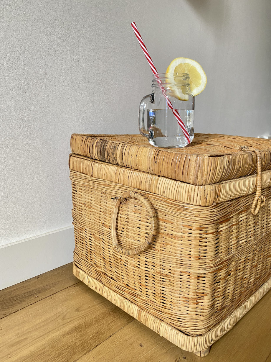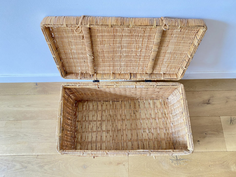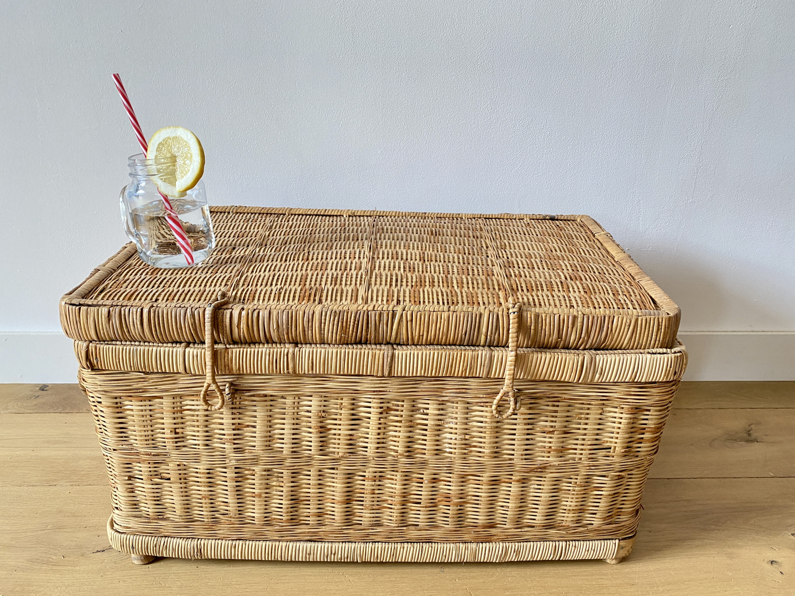 Ambiance bohème garantie ! Parfaite pour agrémenter un petit coin relax, elle pourra également servir de coffre pour les jouets qui trainent dans votre salon ou pour ranger les plaids indispensables aux longues soirées d’hiver. Elle a été nettoyée et certains brins recollés par endroit (certains manques sur l’une des poignées).