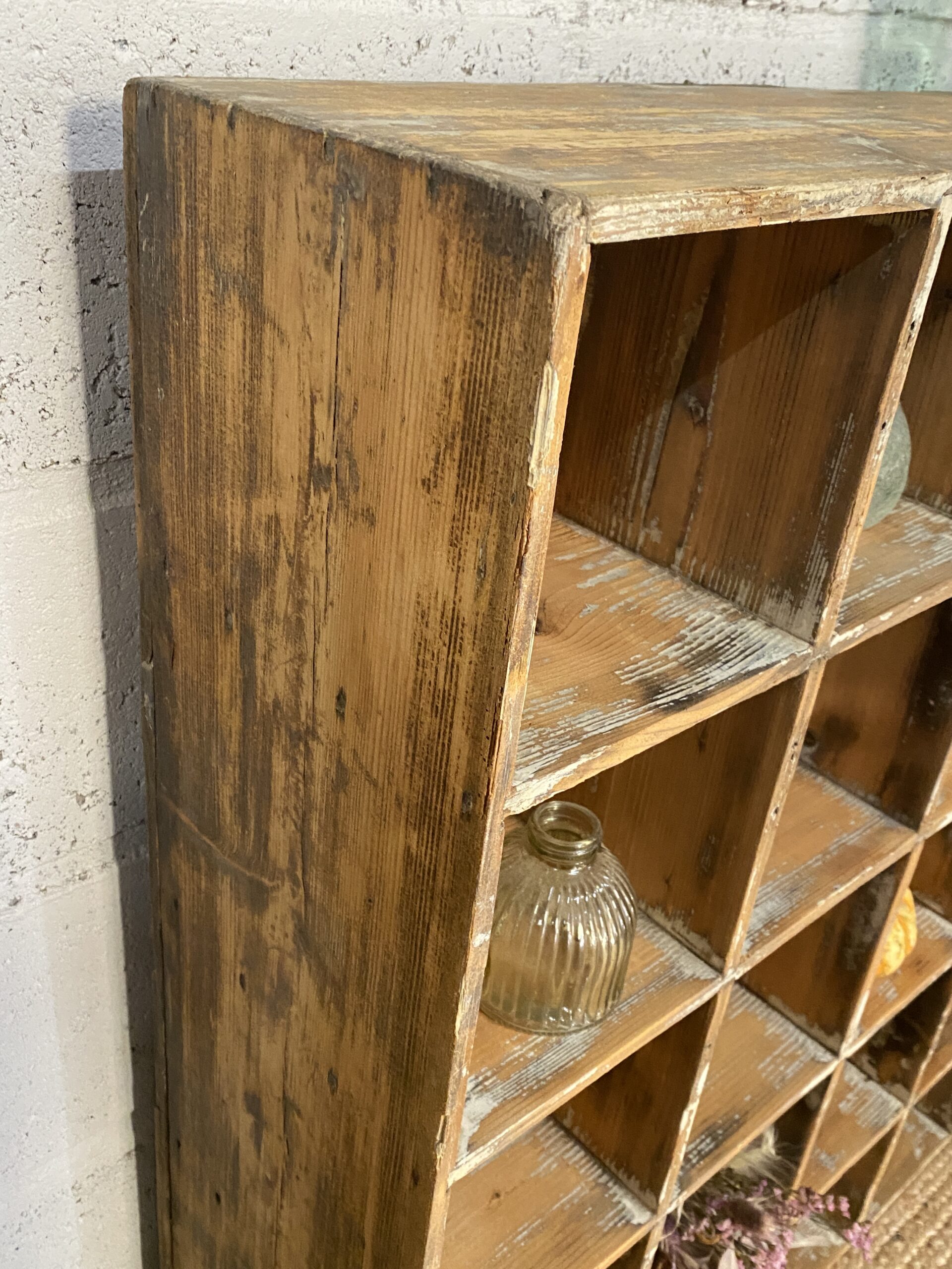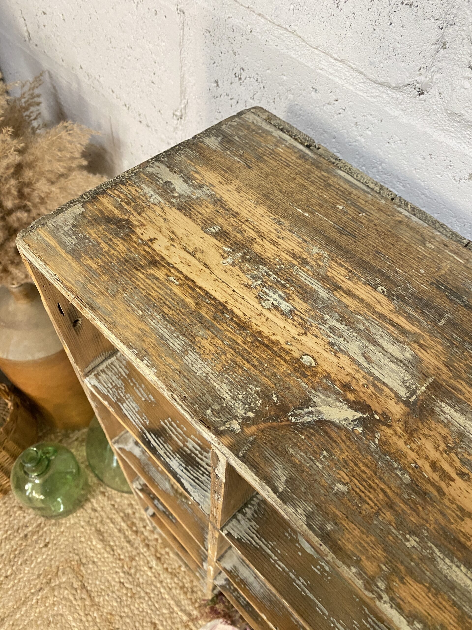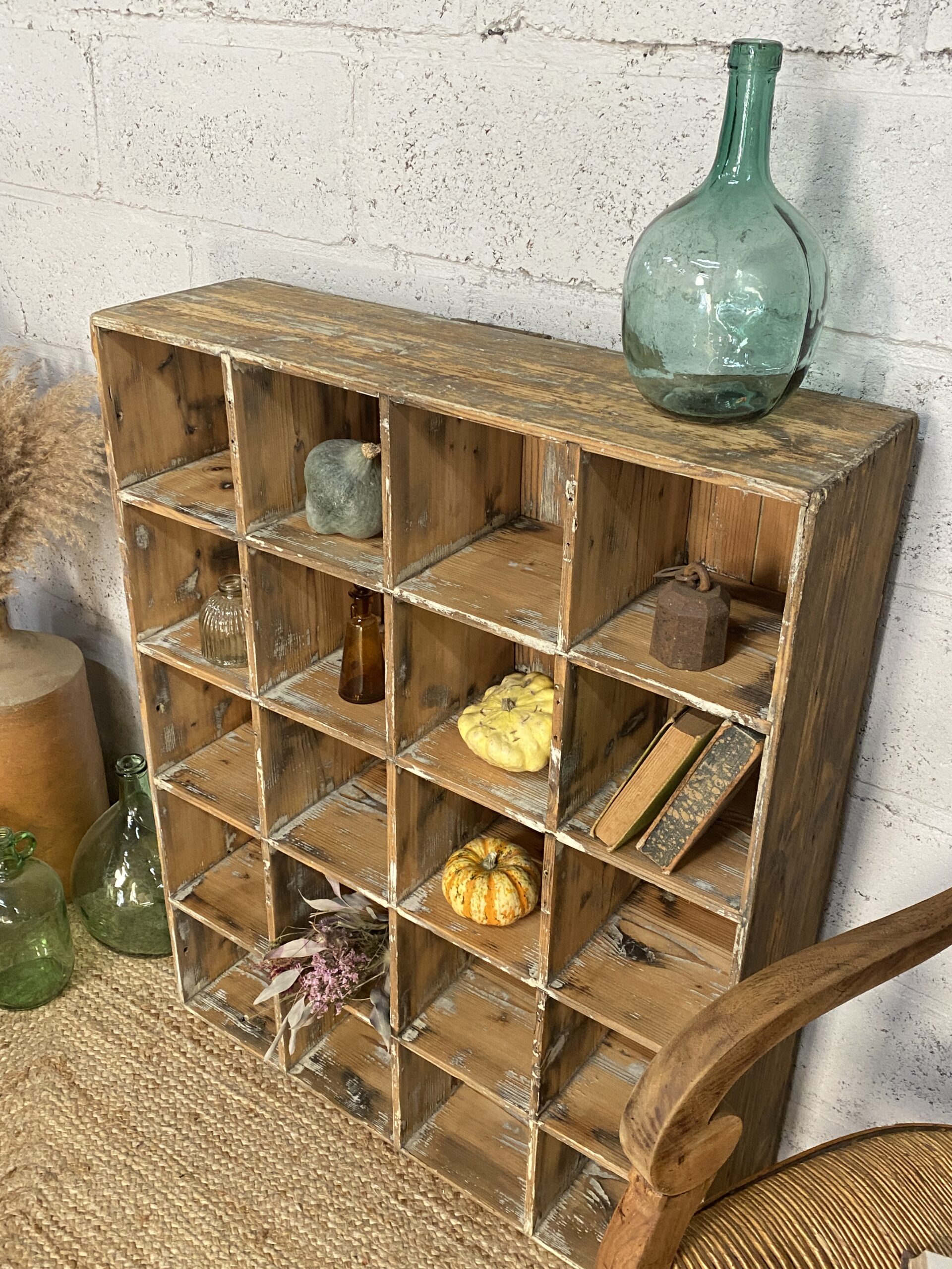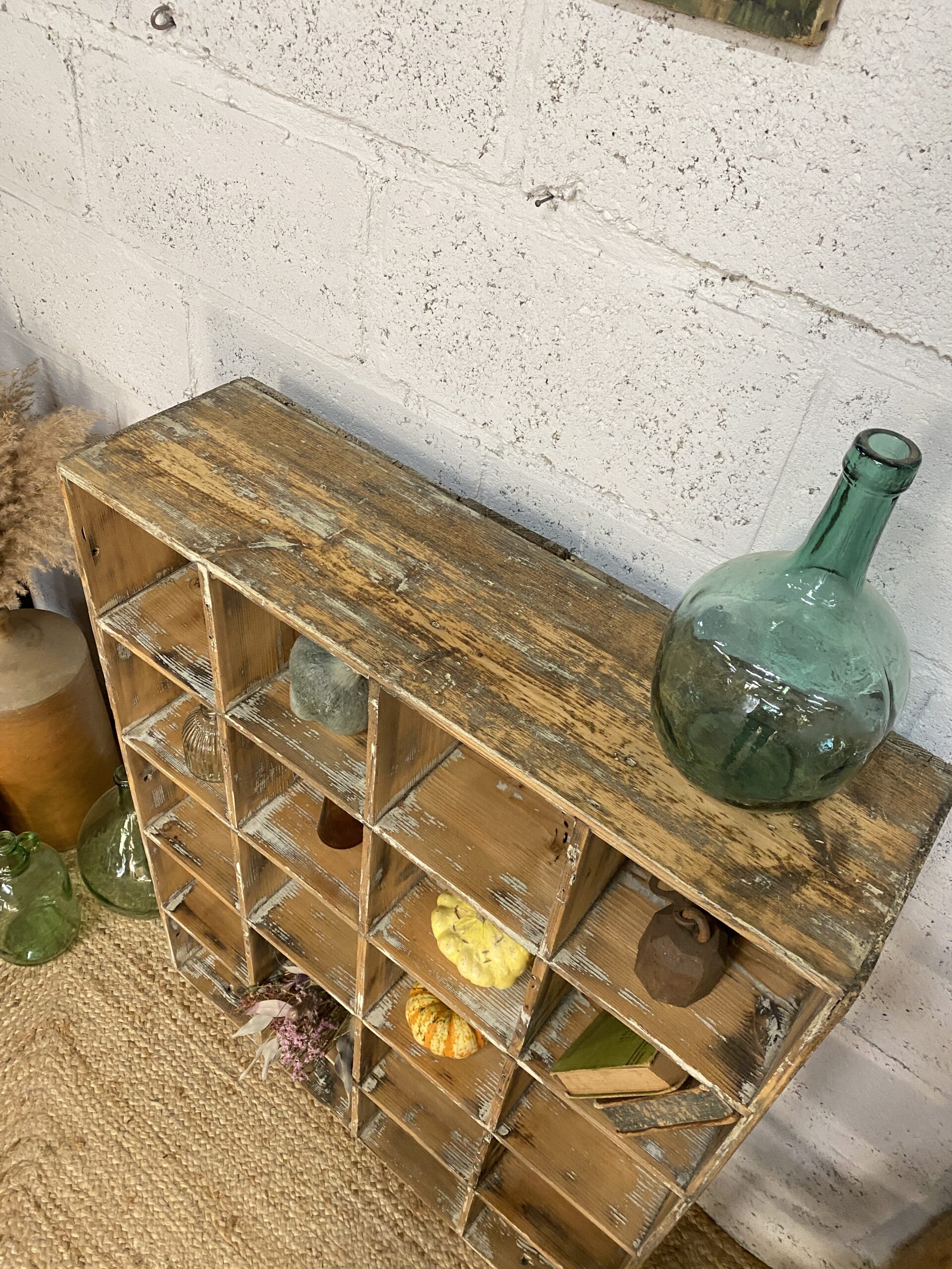 Petit meuble à casiers de garage. Il a été décapé, poncé, lessivé, traité et ciré. Il a un charme fou avec sa patine qui témoigne de son histoire. Parfait pour mettre en valeur votre petite déco, et apporter une touche de caractère à votre intérieur.