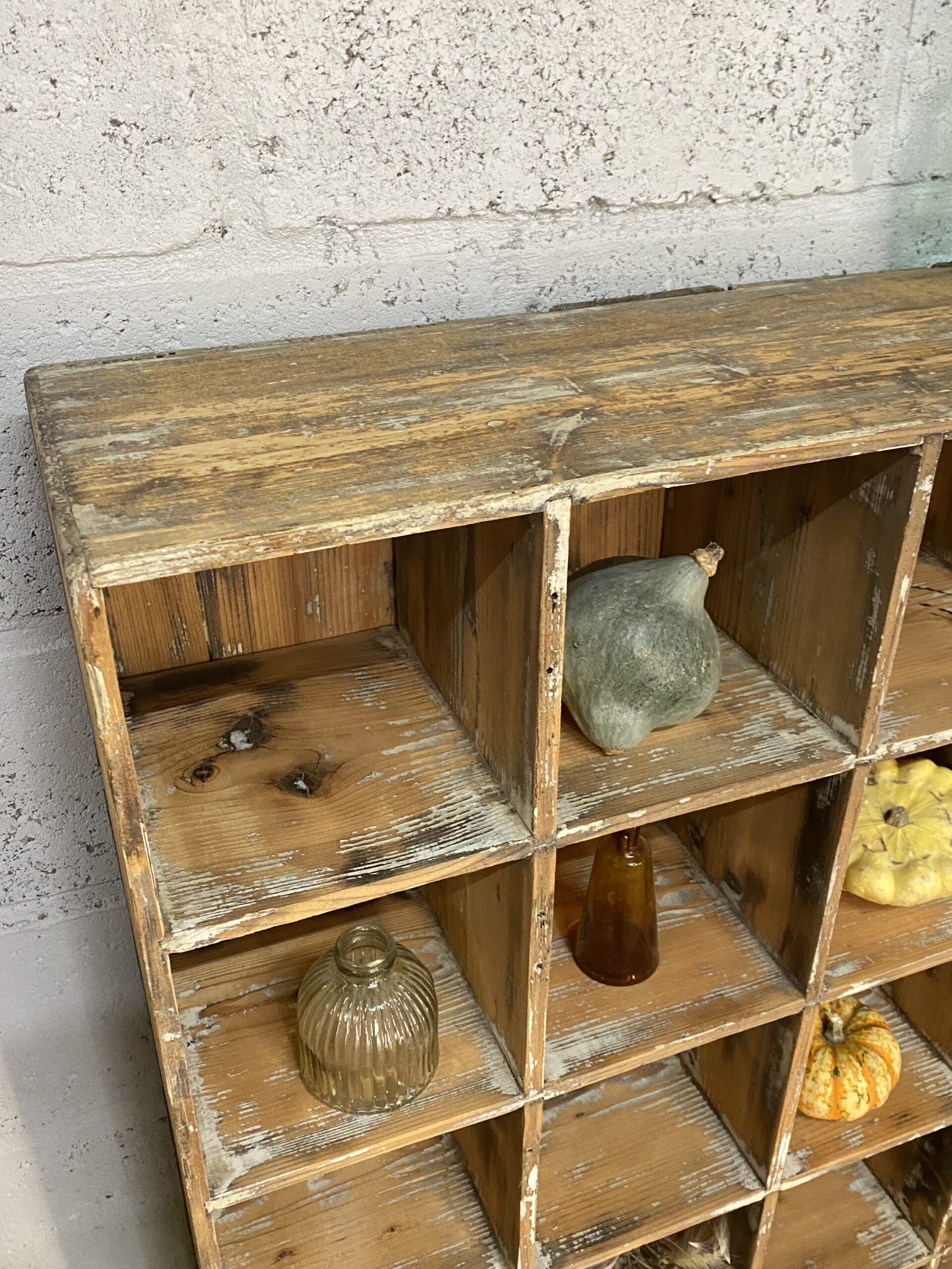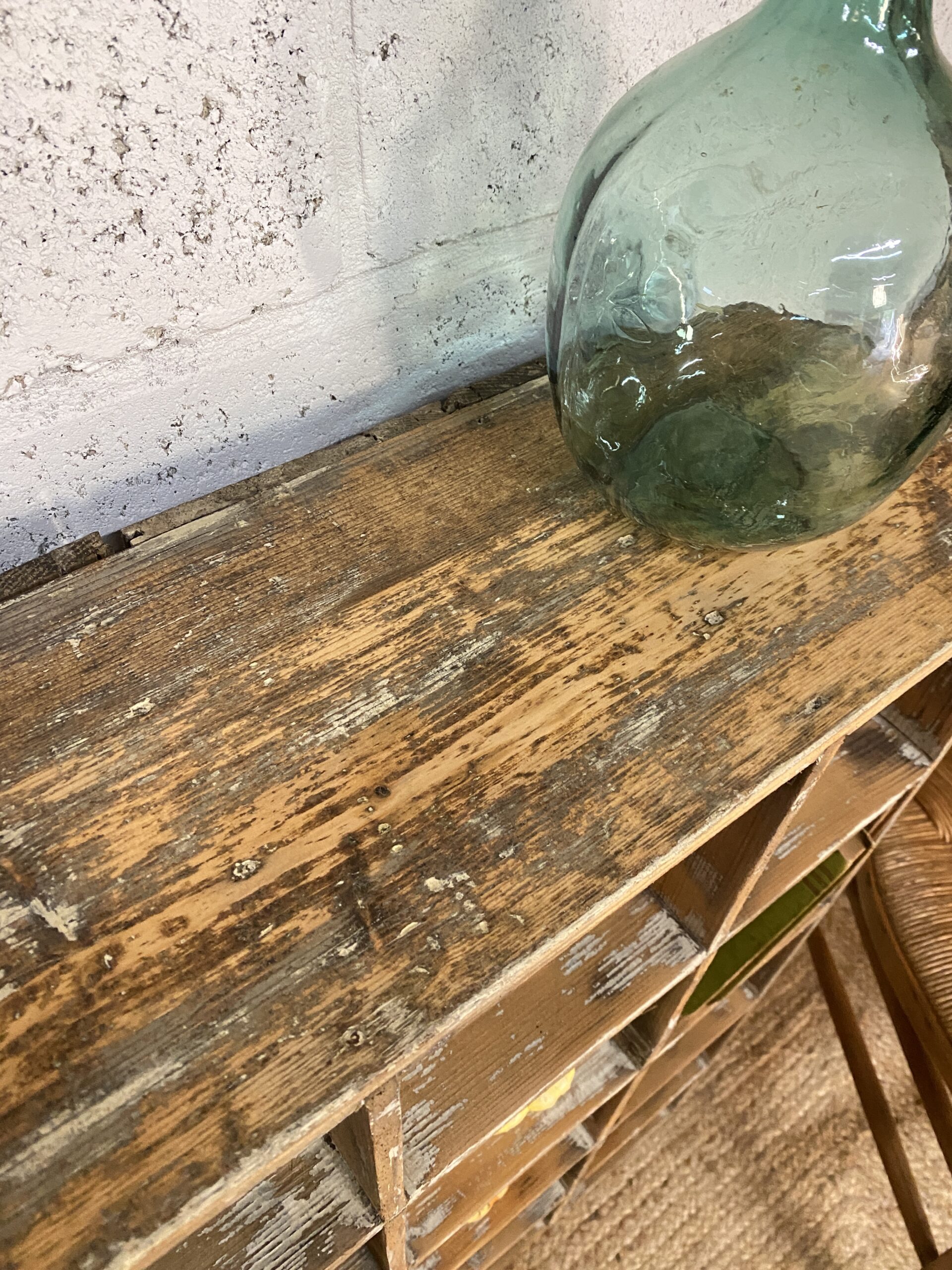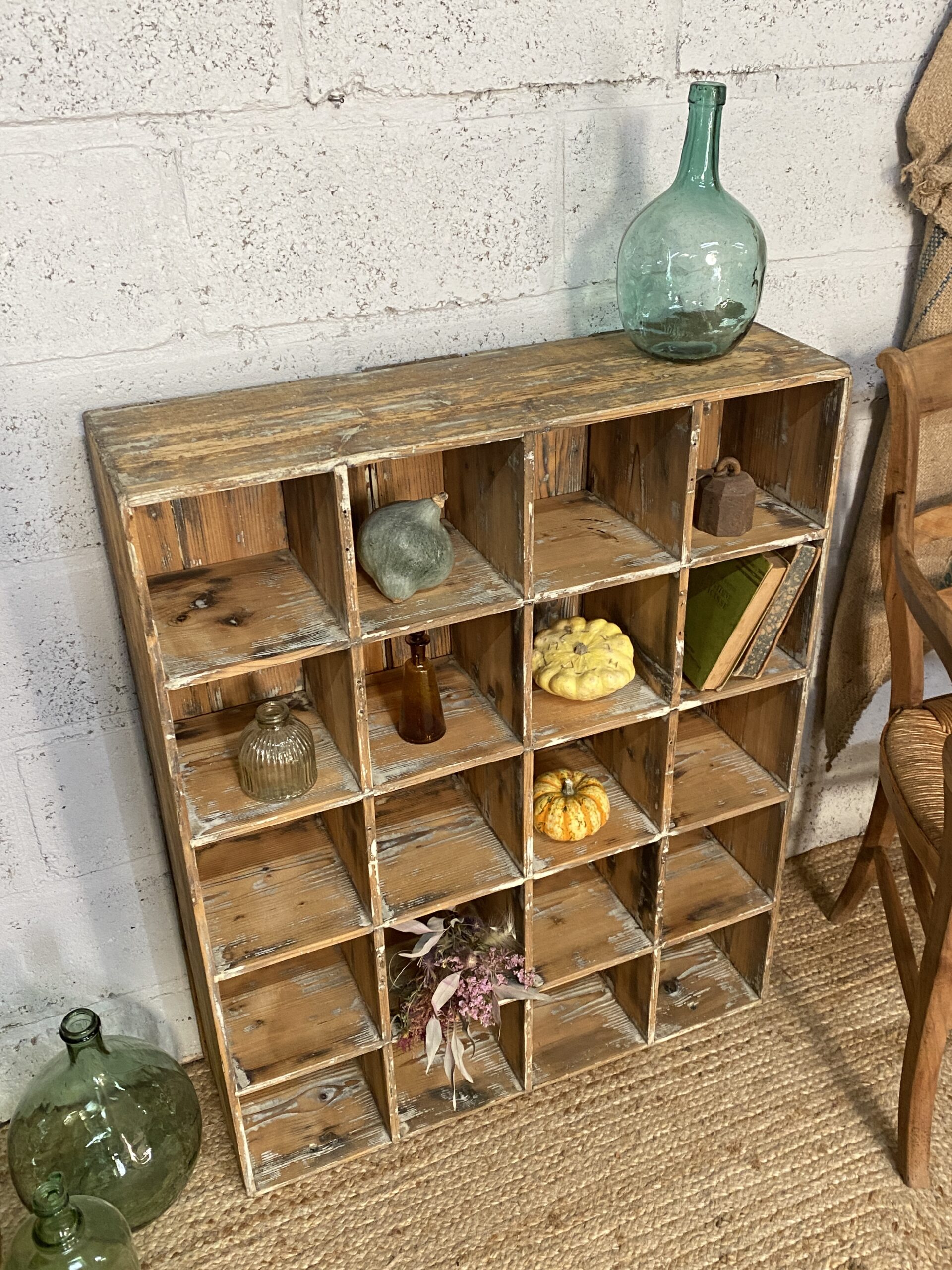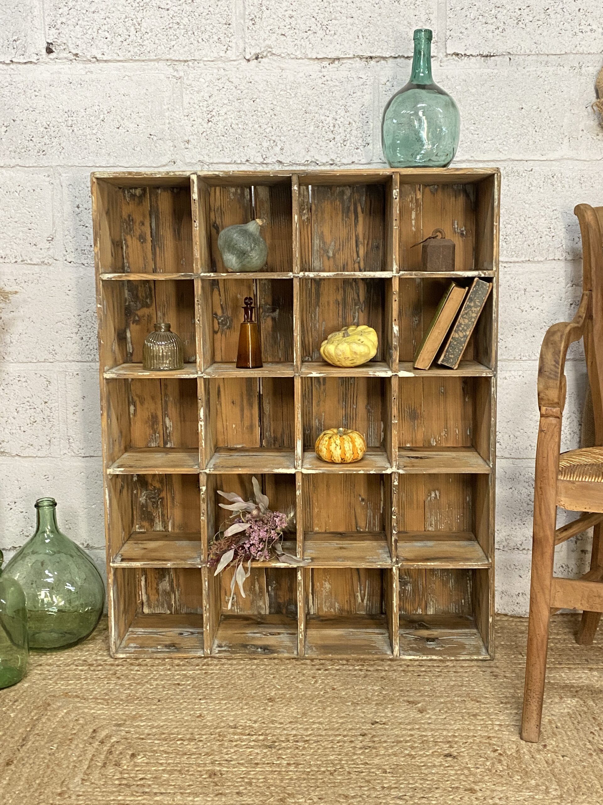 Petit meuble à casiers de garage. Il a été décapé, poncé, lessivé, traité et ciré. Il a un charme fou avec sa patine qui témoigne de son histoire. Parfait pour mettre en valeur votre petite déco, et apporter une touche de caractère à votre intérieur.