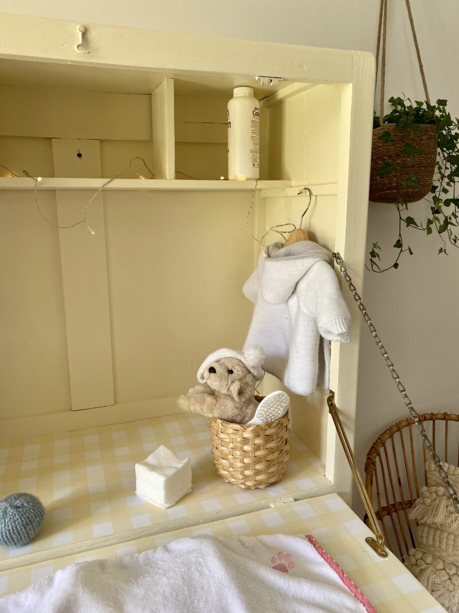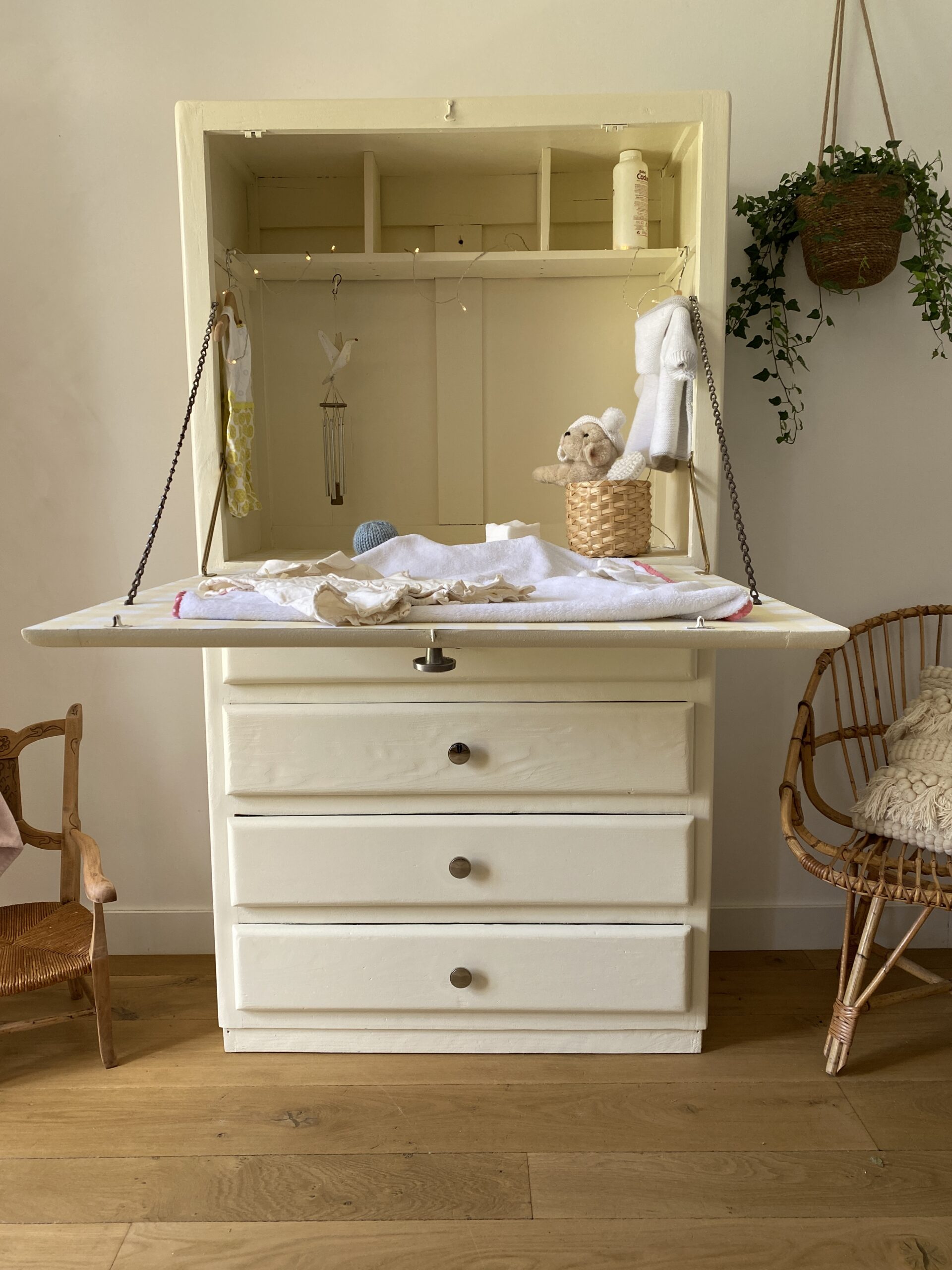 Rare meuble à langer vintage de type Mado. Il possède une grande capacité de rangement avec ses 4 tiroirs et son grand casier. La table à langer se replie pour un gain de place maximum. Évolutif, il peut aussi être envisagé comme secrétaire (en utilisant une chaise un peu haute). Cette pépite a vu passer plusieurs générations et comporte donc quelques traces du temps (bosses ou imperfections). Les charnières sont neuves et elle a été repeinte dans une couleur vanille. L’intérieur est tapissé d’un papier peint intissé en vichy jaune clair. Prévoir de la fixer au mur par le crochet arrière prévu à cet effet pour plus de sécurité.