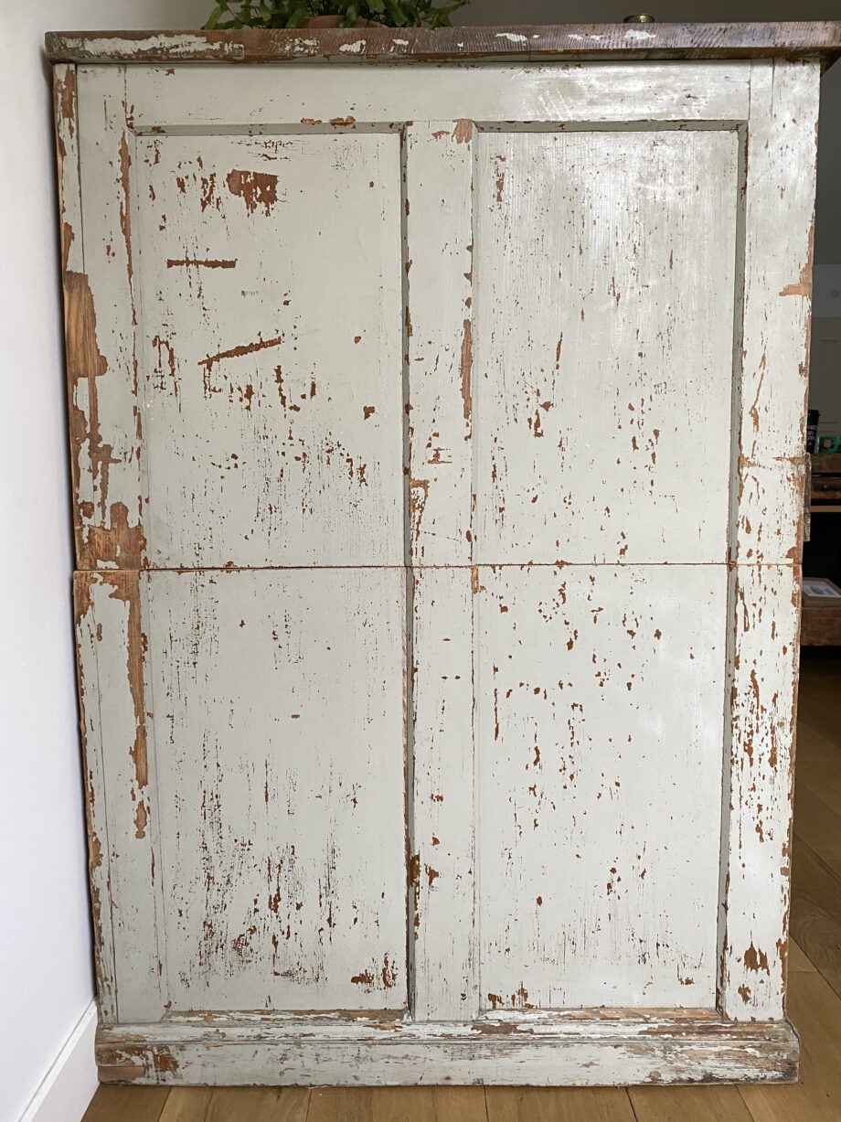 Magnifique ancien grand meuble de métier destiné à accueillir des planches de dessins ou d’imprimerie. Dans son ancienne vie, il était placé sous une sous-pente et avait donc été coupé en deux. À nouveau en un seul morceau, il a retrouver tout son charme ! Il comporte 6 tiroirs et non pas 8 comme ont l’imagine sur les photos car deux paires de tiroirs ont été rassemblées par le passé pour augmenter la hauteur de rangement (22 cm). Il a été traité entièrement, sa patine d’origine a été nettoyée, l’intérieur entièrement poncé et nettoyé. Le plateau est verni (mat incolore) pour le protéger. L’ancienne coupure est un peu visible sur les côtés mais elle s’intègre bien avec les autres traces du temps.