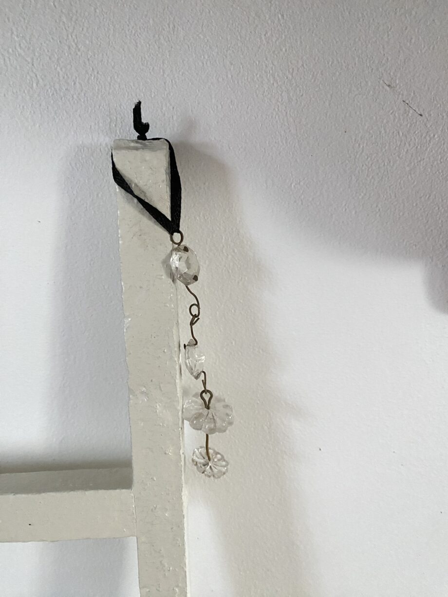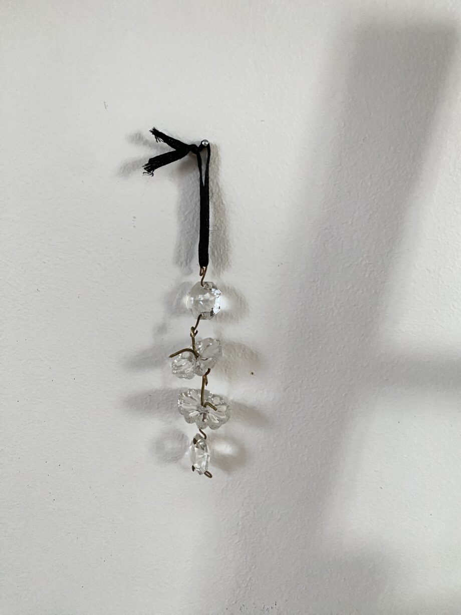 Pampilles décoratives upcyclées en forme de guirlandes de fleurs, réalisées à partir de breloques de lustres cassés et d’un fil doré. Elles feront de magnifiques décorations de Noël à suspendre sur le sapin, responsables et élégantes. Plusieurs modèles de pampilles disponibles sont sur le site. Tarif unitaire.