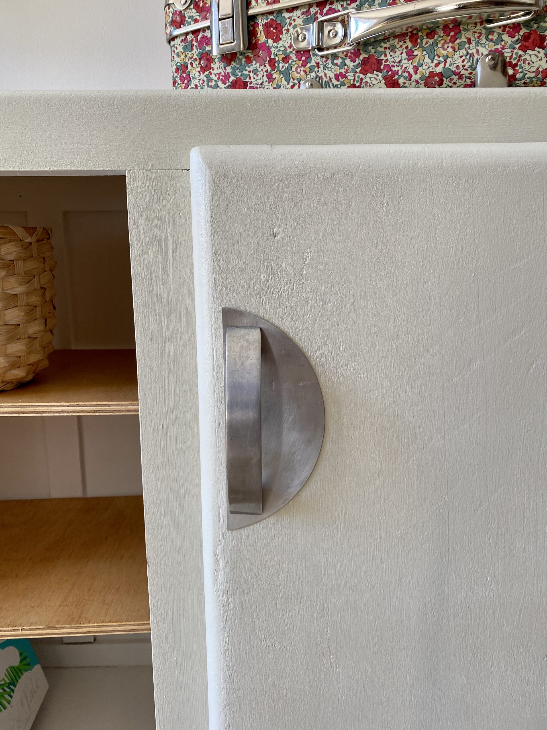 Ancien meuble haut de cuisine transformé en petit buffet. Décapé, poncé, nettoyé et remis en couleur dans un blanc chaud à l’extérieur et un blanc neutre à l’intérieur. un vernis vitrificateur a ensuite été appliqué pour le protéger. Les pieds ont été ajoutés ainsi que les deux étagères de gauche (celles de droite sont fixées d’origine). Ses belles poignées chromées sont d’origine. Son format est idéal pour une chambre d’enfant ou comme console dans une entrée.