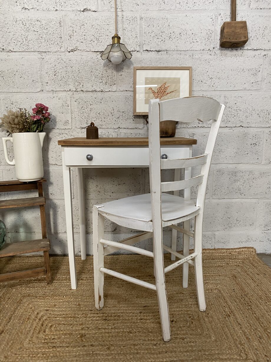 Petite table des années 50 avec ses boutons chromés d’origine. Le plateau a été changé car il était en formica et avait trop souffert. Elle possède un grand tiroir. Elle a été poncée et repeinte. Le plateau a été récupéré d’un ancien meuble. Il a donc avec une jolie patine ancienne. Il a été décapé, poncé et verni. Elle pourra être utilisée en table d’appoint dans une entrée ou en petit bureau dans une chambre d’enfants par exemple.