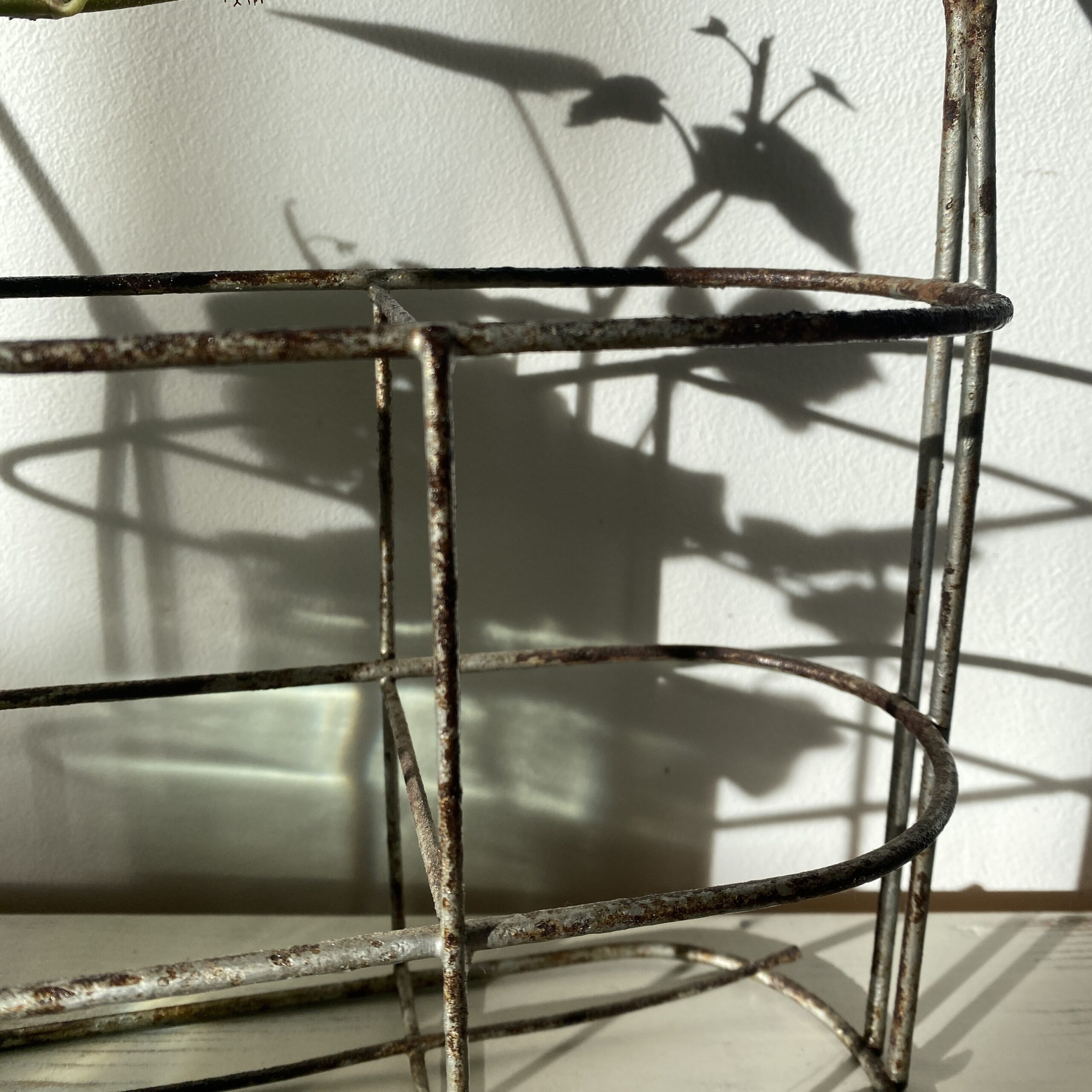 Porte-bouteilles ancien en fer, tout en délicatesse ! Il possède 3 compartiments. Il a une magnifique poignée et beaucoup de charme avec sa jolie patine d’usage. il a été passé à la brosse de fer et traité contre la rouille. Très bel objet de décoration pour faire un porte-plantes par exemple dans un style brocante, wabi-sabi.