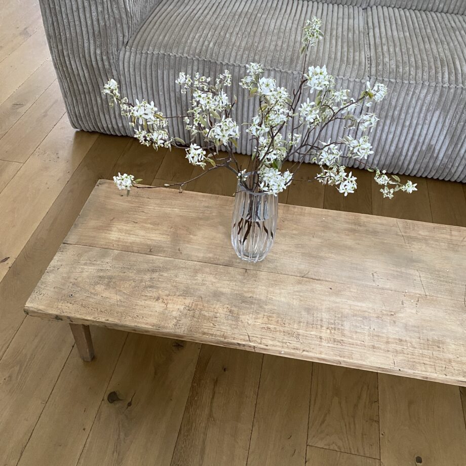 Grande table basse réalisée à partir d’un ancien plateau en bois massif et de pieds de table de ferme (coupée en table basse). Le plateau a été traité, poncé, protégé avec un fondur puis un vernis incolore mat. Sobre et élégante, elle deviendra la pièce maîtresse de votre salon.