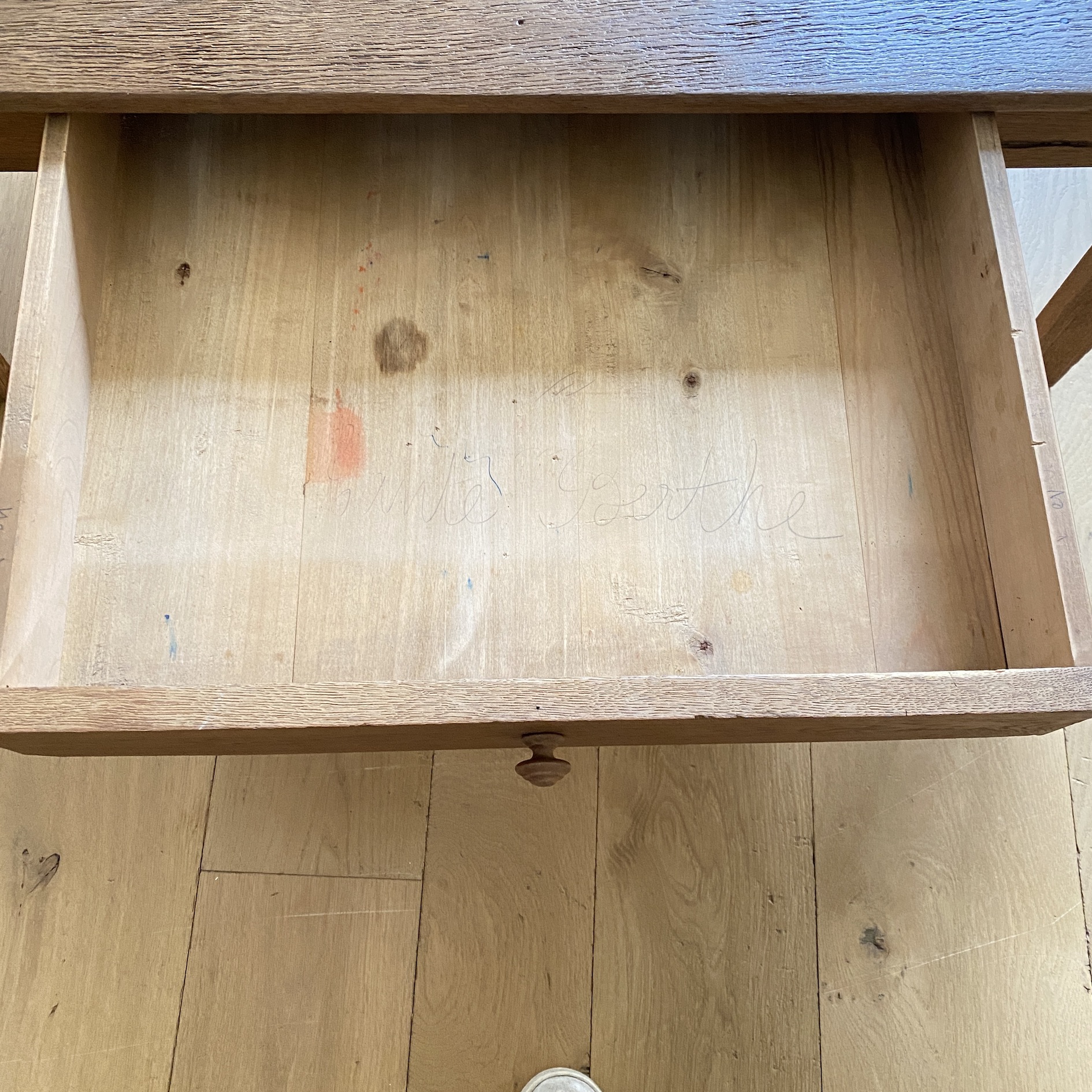 Table basse (plutôt grande) possédant un grand tiroir. Cette ancienne table de ferme en bois brut a été traitée, poncée, et le plateau verni. Il reste quelques tâches dans le tiroir et une inscription « tante Berthe » dans une jolie écriture que je n’ai pas voulu enlever. Elle sera parfaite pour accueillir du monde à l’apéro !