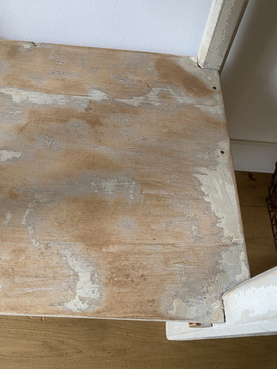 Petite table de caractère avec une étagère et un tiroir. Sa poignée coquille est d’origine. Elle a été décapée, poncée et nettoyée. Le plateau est repeint et verni et l’étagère a été patinée et vernie. Idéale dans une entrée pour poser une lampe en adoptant le style wabi-sabi.