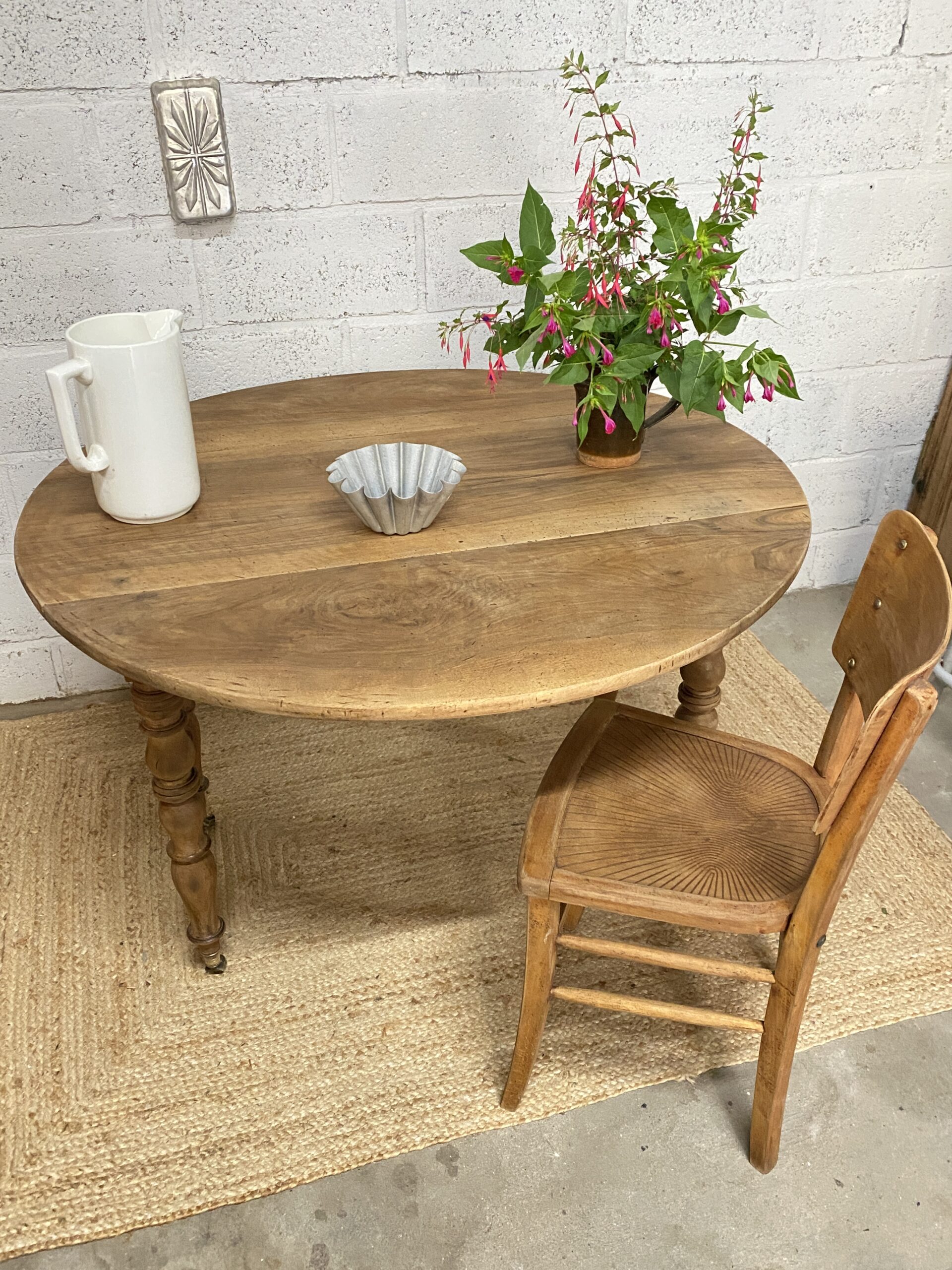 Très jolie table à rabats en noyer avec ses pieds tournés et ses jolies roulettes en laiton. Elle a été poncée, traitée, cirée au niveau du piètement. Le plateau quant à lui a été verni. À noter : quelques traces de piqûres anciennes sous le plateau. Cette table modulable sera très pratique dans une cuisine ou dans un petit espace.